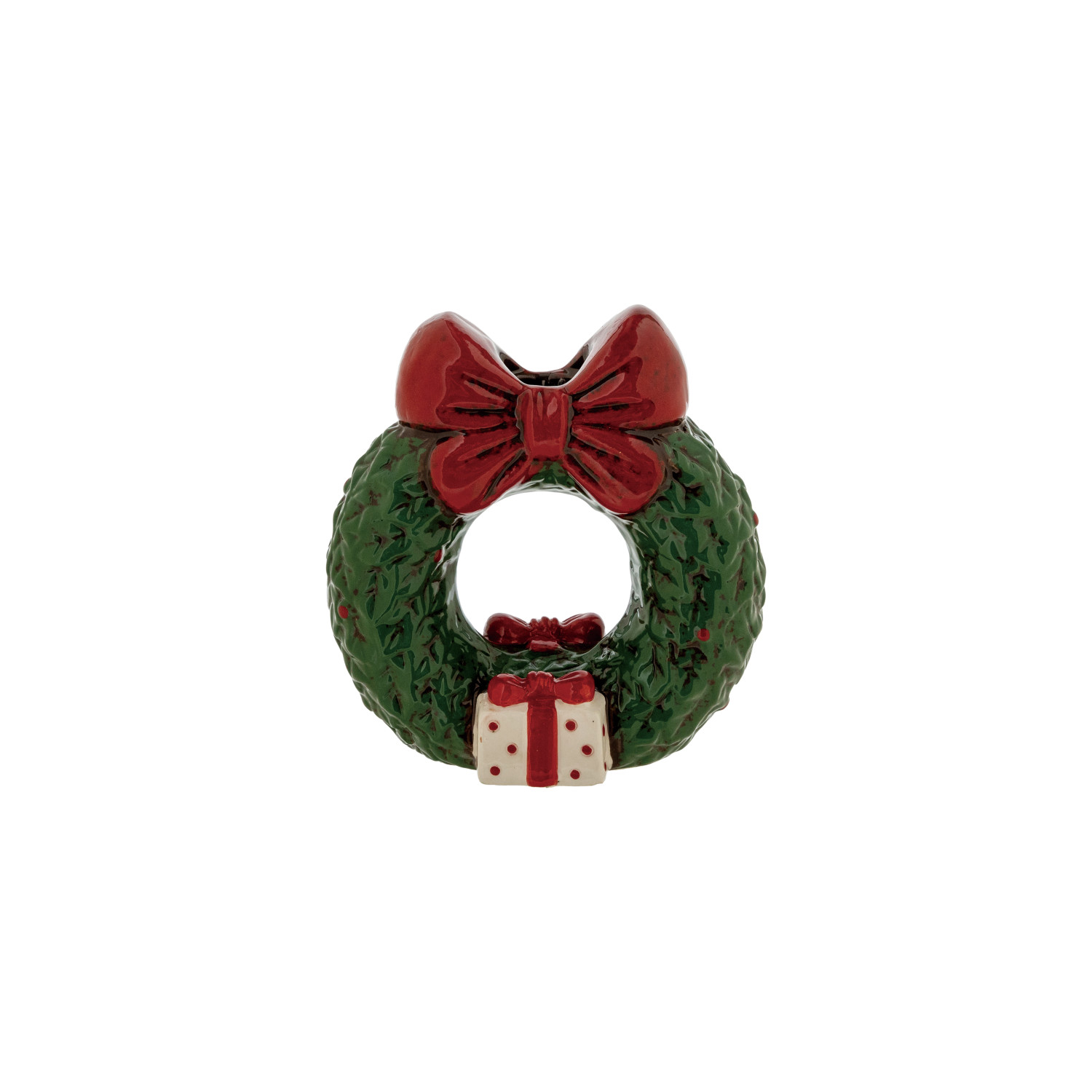 Catalog Name: 5-1/4" Round Hand-Painted Ceramic Wreath Shaped Taper Holder w/ Bow, Reactive Glaze, Green, Red & White (Each One Will Vary)