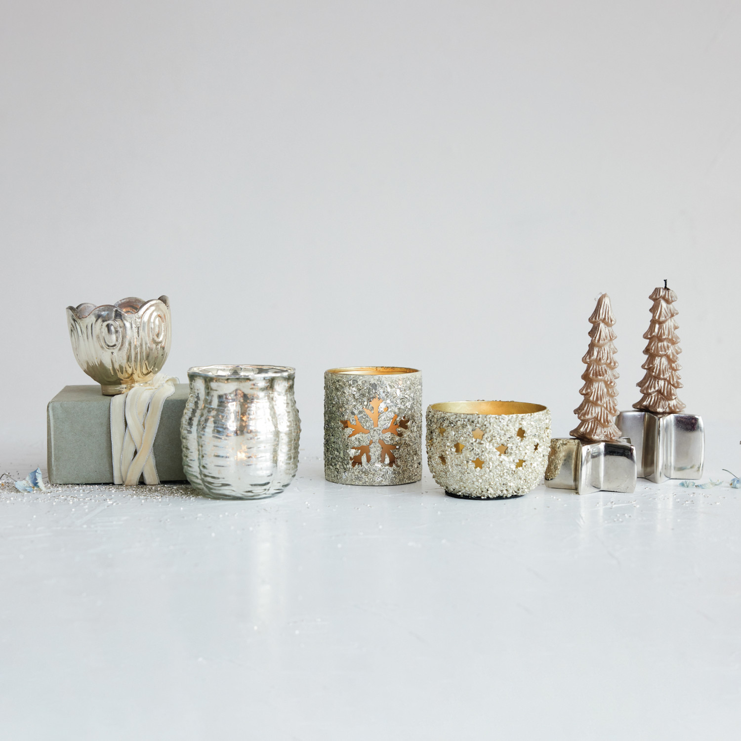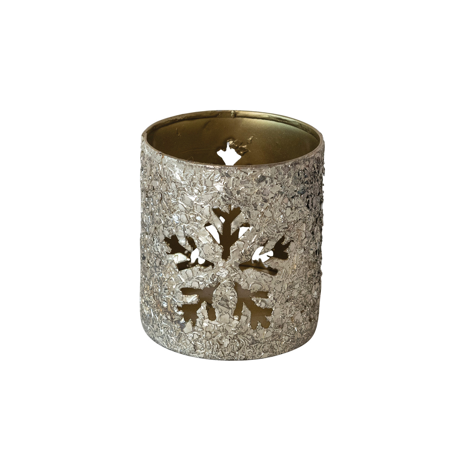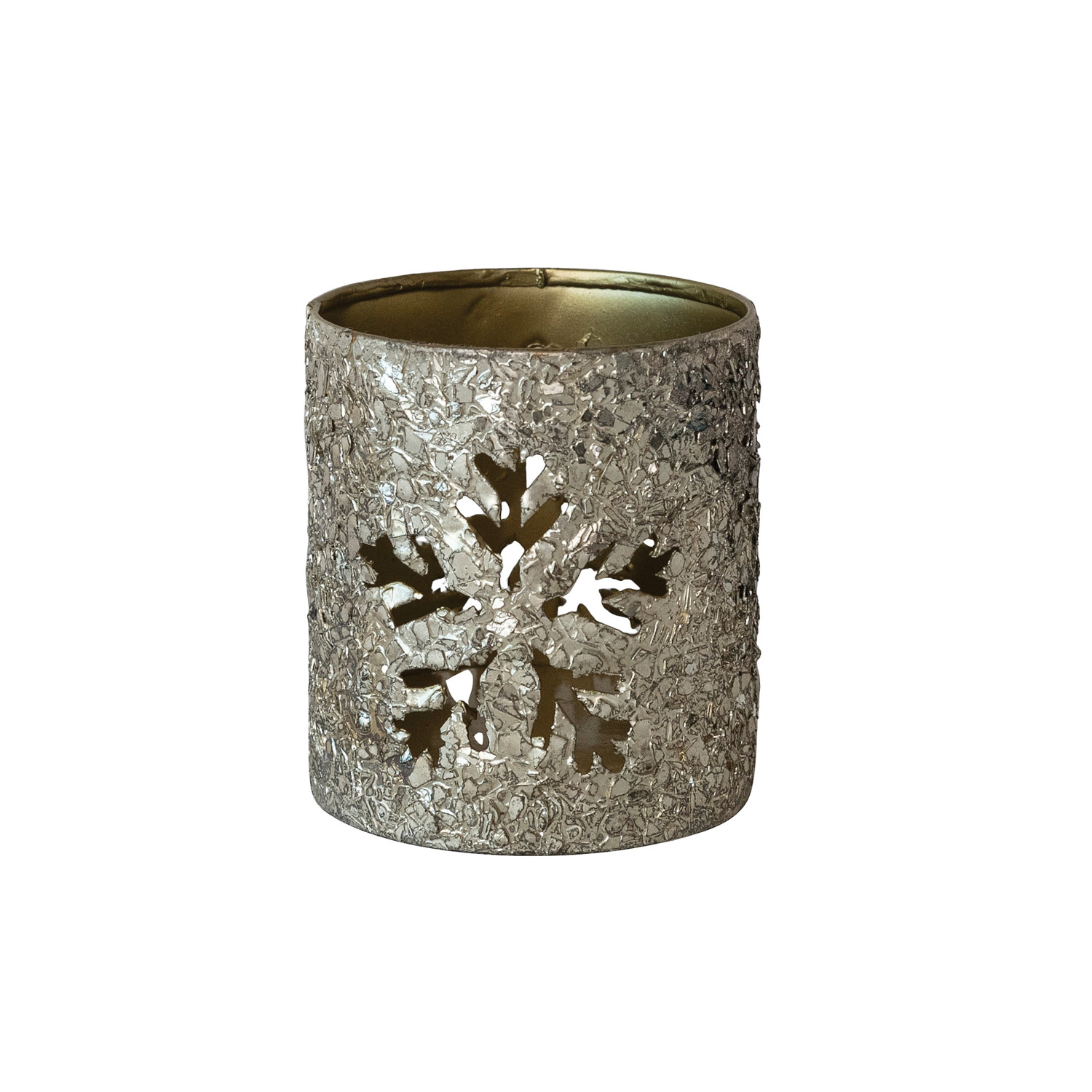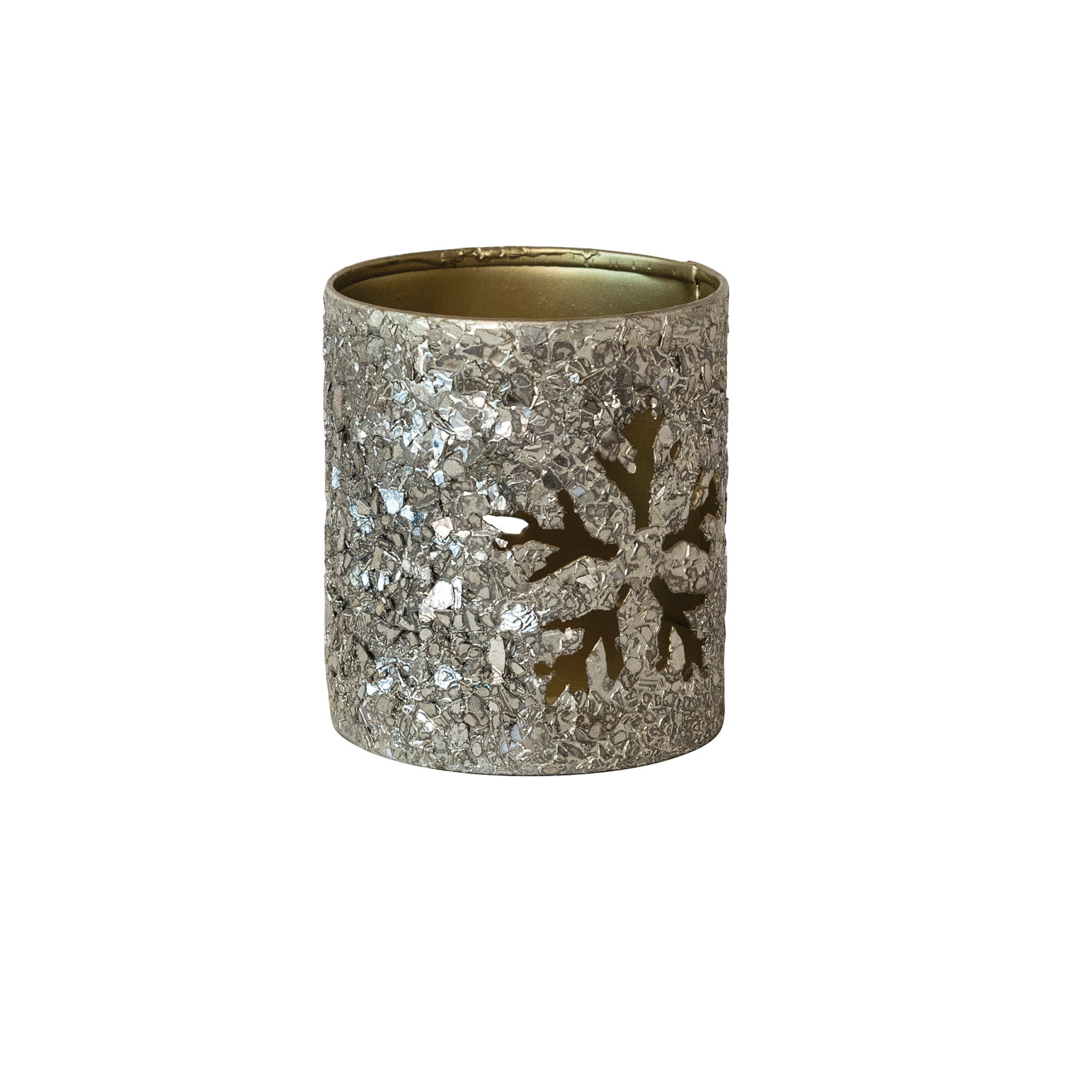 Catalog Name: 2-3/4" Round x 3-1/4"H Metal Tealight/Votive Holder w/ Mica Flakes & Snowflake Cut-Outs, Antique Silver Finish