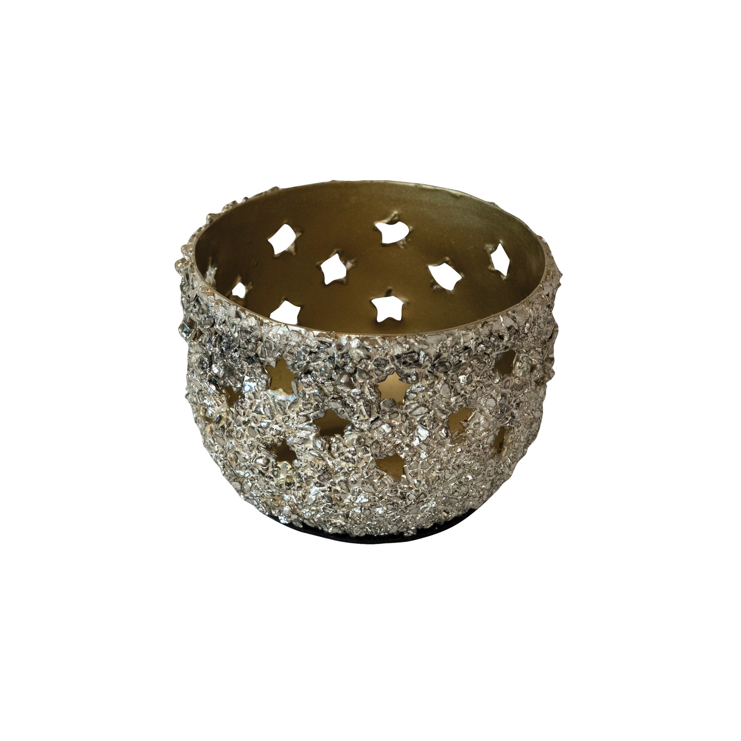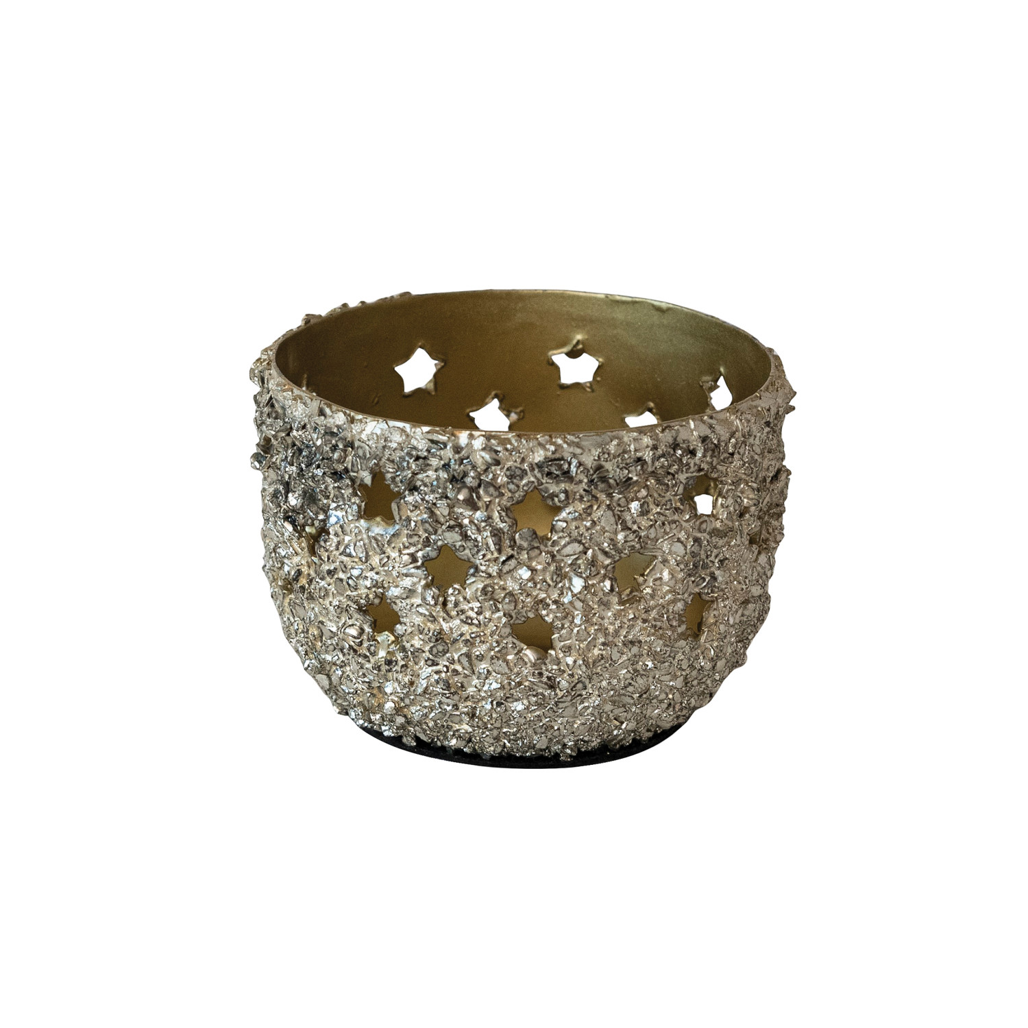 Catalog Name: 3-1/2" Round x 2-1/4"H Metal Tealight/Votive Holder w/ Mica Flakes & Star Cut-Outs, Antique Silver Finish