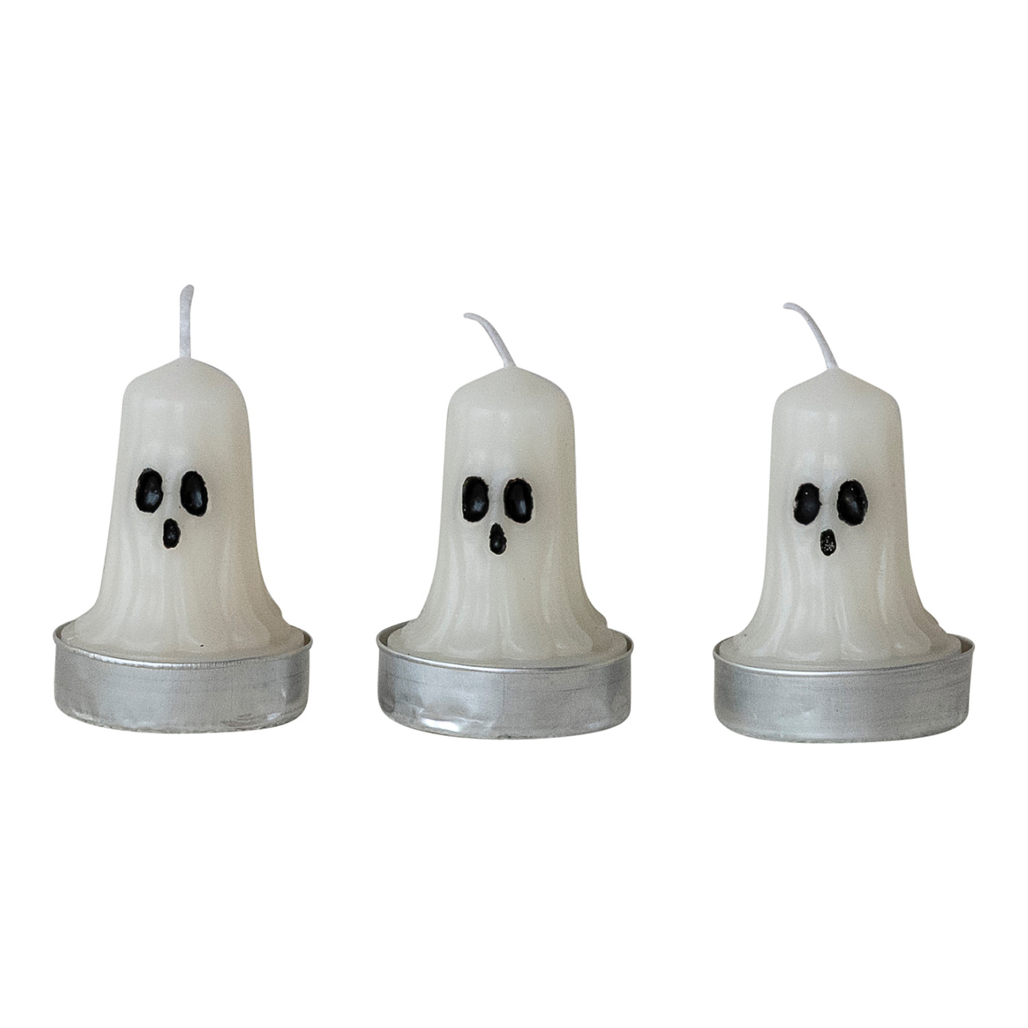 Catalog Name: 1-1/2" Round Unscented Ghost Shaped Tealights in Box, White & Black, Set of 9 (Est. Burn Time 3-1/2 Hours)