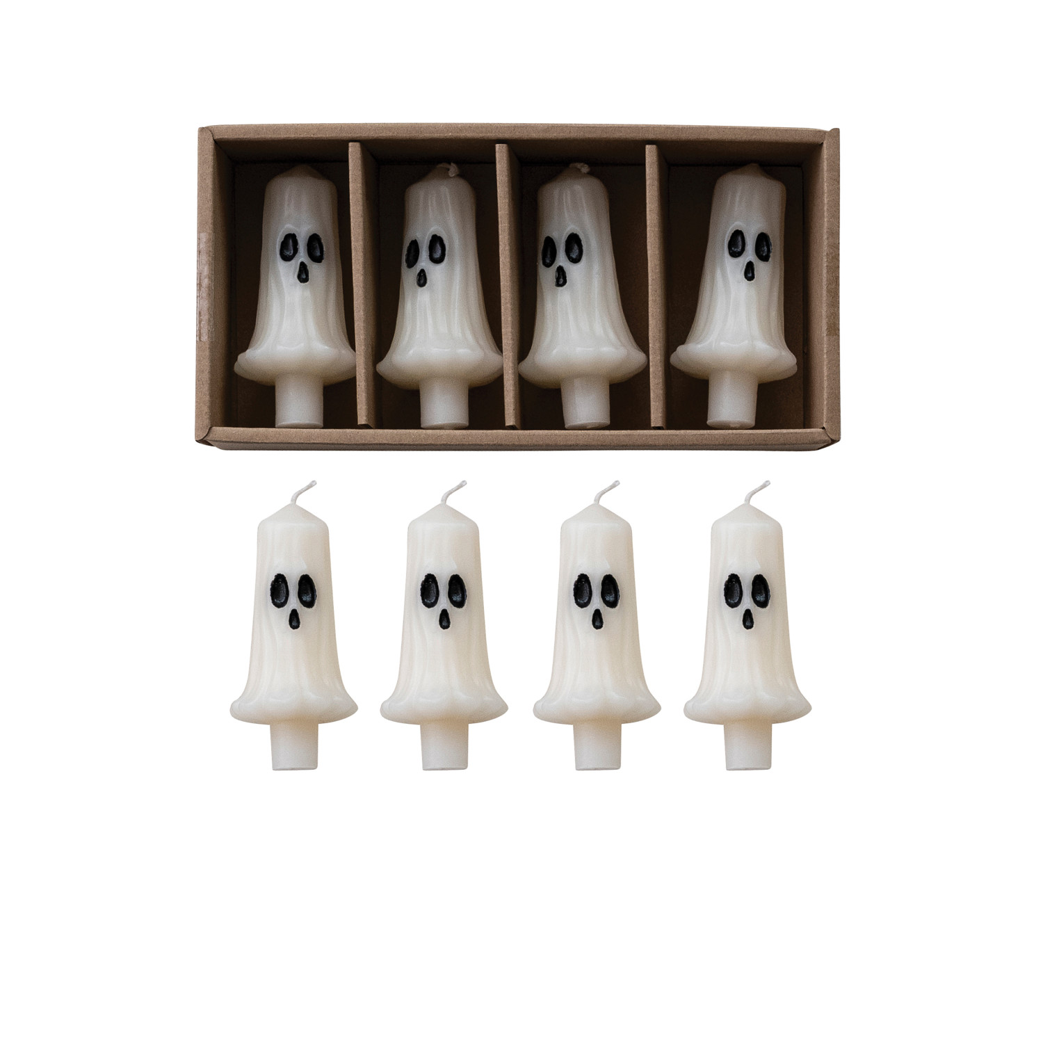 Catalog Name: 3-3/4"H Unscented Ghost Shaped Bottle Taper Candles in Box, White & Black, Set of 4 (Est. Burn Time 4 Hours)