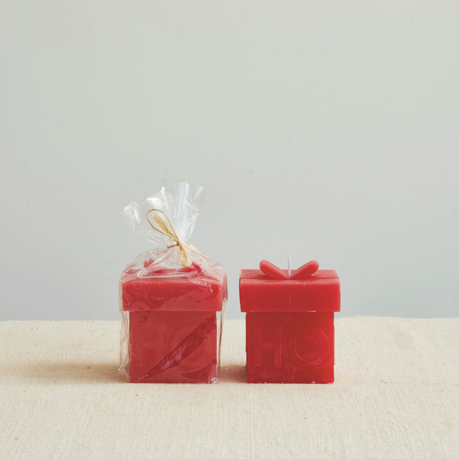 Catalog Name: 3-1/2" Square x 4"H Unscented Gift Box Shaped Candle "Ho Ho Ho", Red (Approximate Burn Time 50 Hours)