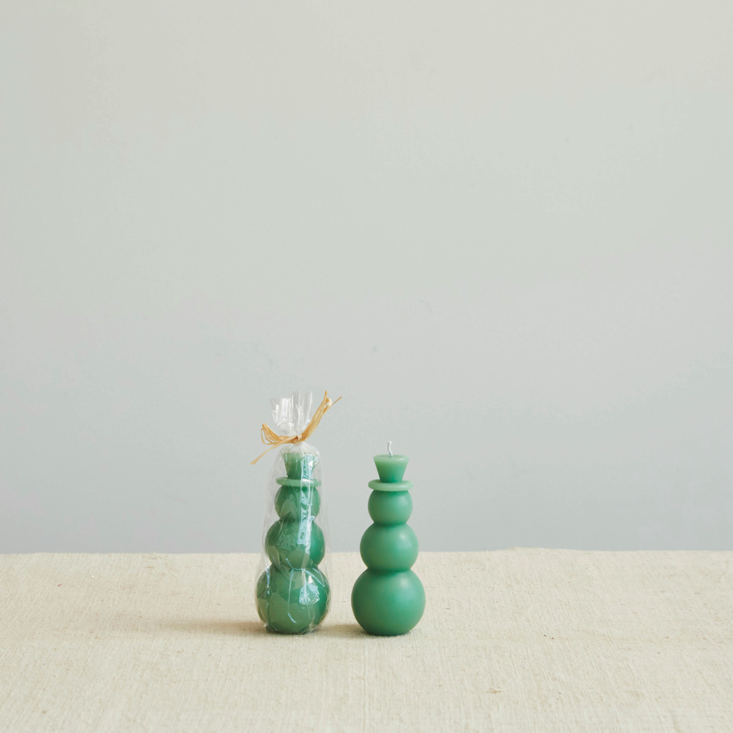 Catalog Name: 2" Round x 4-1/2"H Unscented Snowman Shaped Candle, Green (Approximate Burn Time 5 Hours)