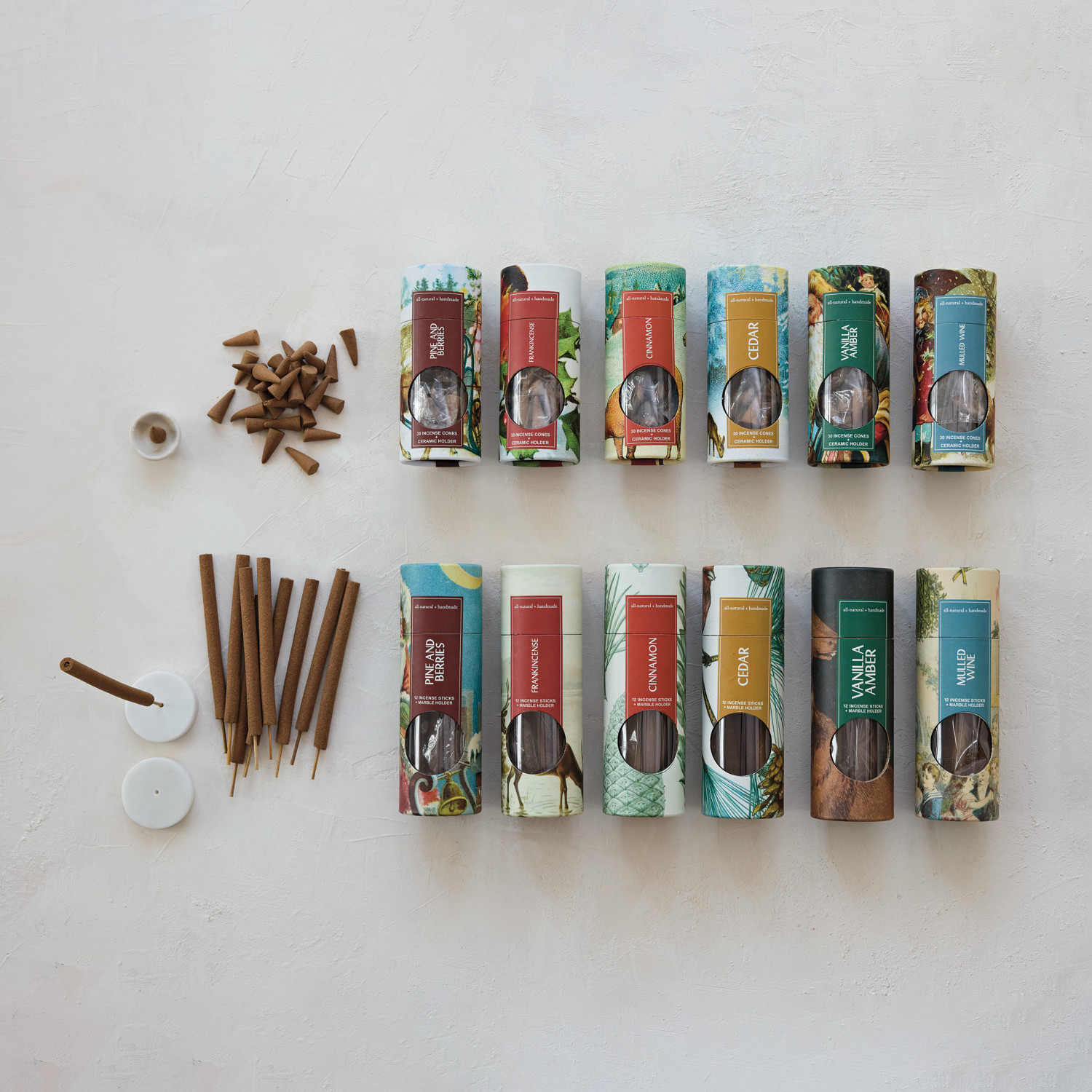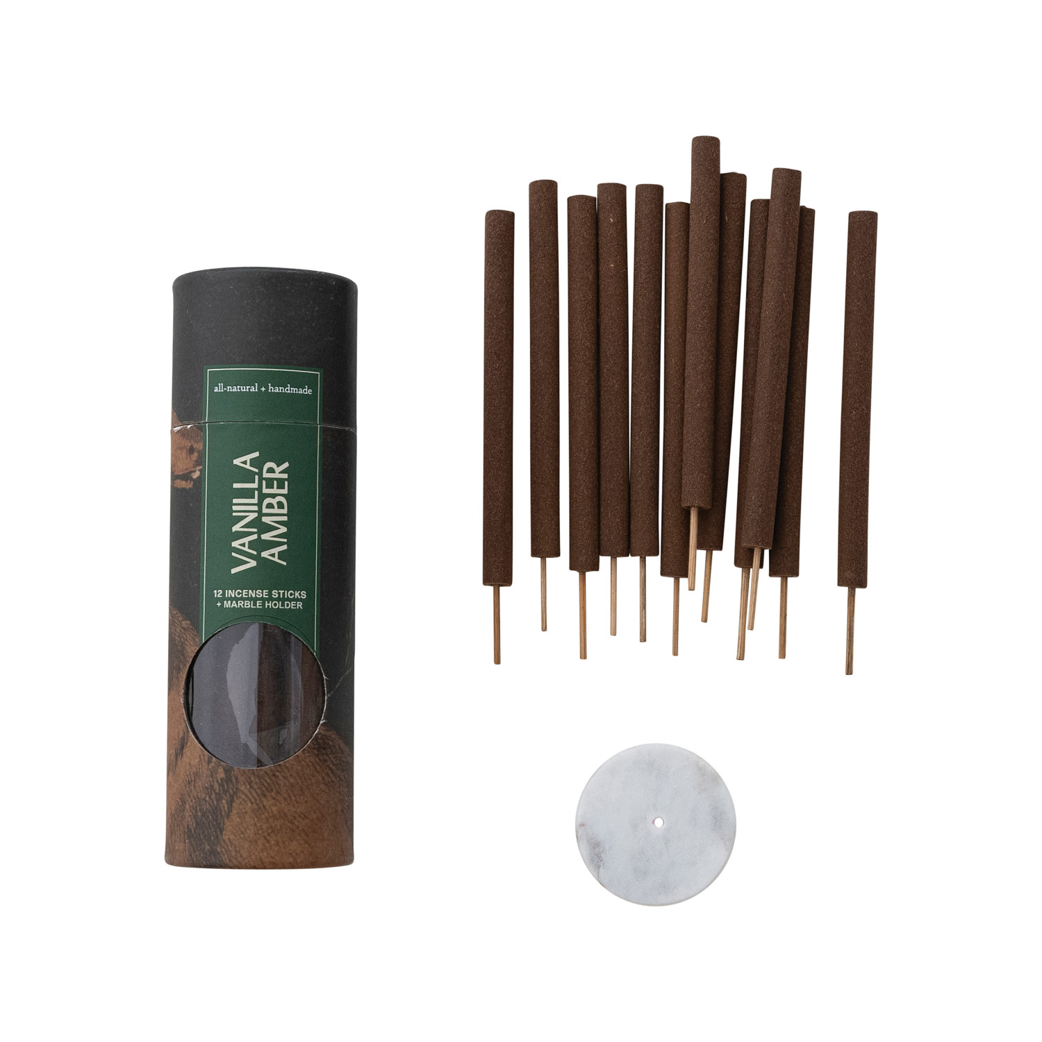 Catalog Name: 6"L 12 Piece All Natural Handmade Vanilla Amber Scented Thick Incense Sticks in Printed Tube w/ 2" Round White Marble Incense Holder, Set of 13 (Est. Burn Time 45 Minutes)