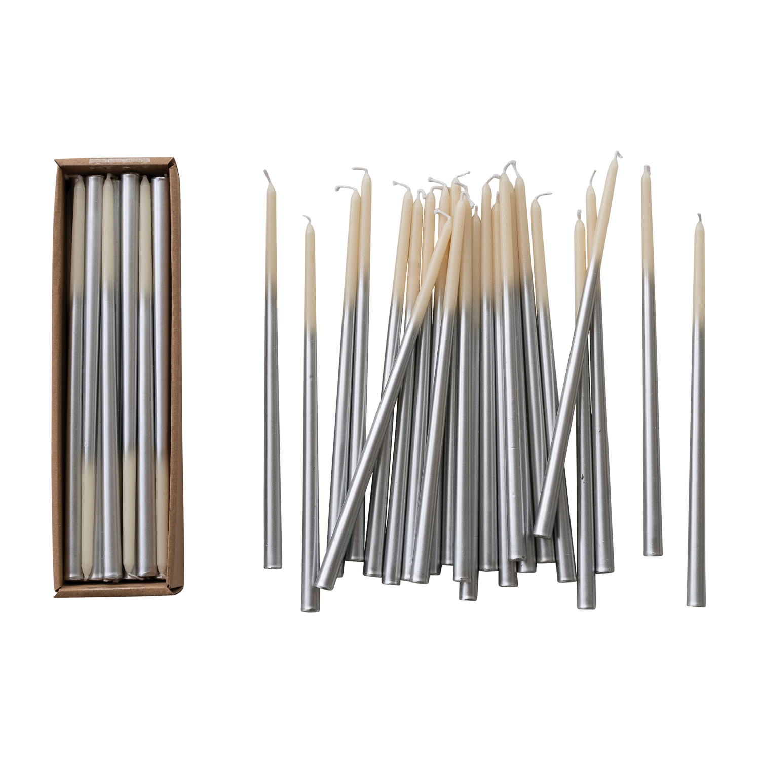 Catalog Name: Approx. 1/2" Round x 10"H Unscented Two-Tone Thin Taper Candles in Box, Cream & Silver Color, Set of 24 (Est. Burn Time 3-1/2 Hours)