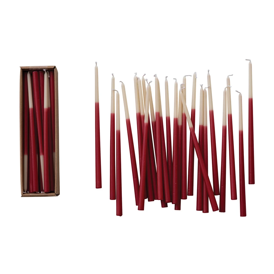 Unscented Two-Tone Thin Taper Candles in Box & Red, Set of 24 (Est. Burn Time 3-1/2 Hours)