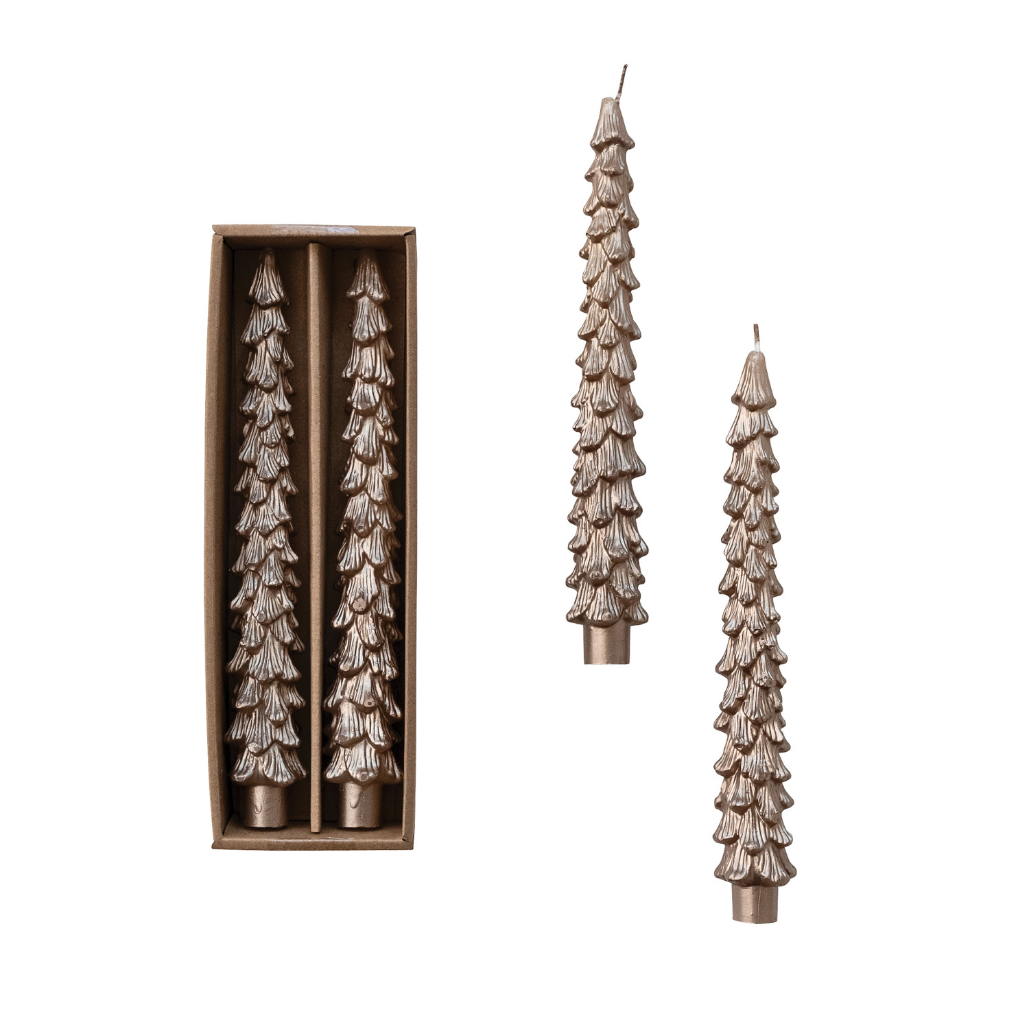 Catalog Name: 10"H Unscented Tree Shaped Taper Candles in Box, Champagne Color, Set of 2 (Est. Burn Time 10 Hours)