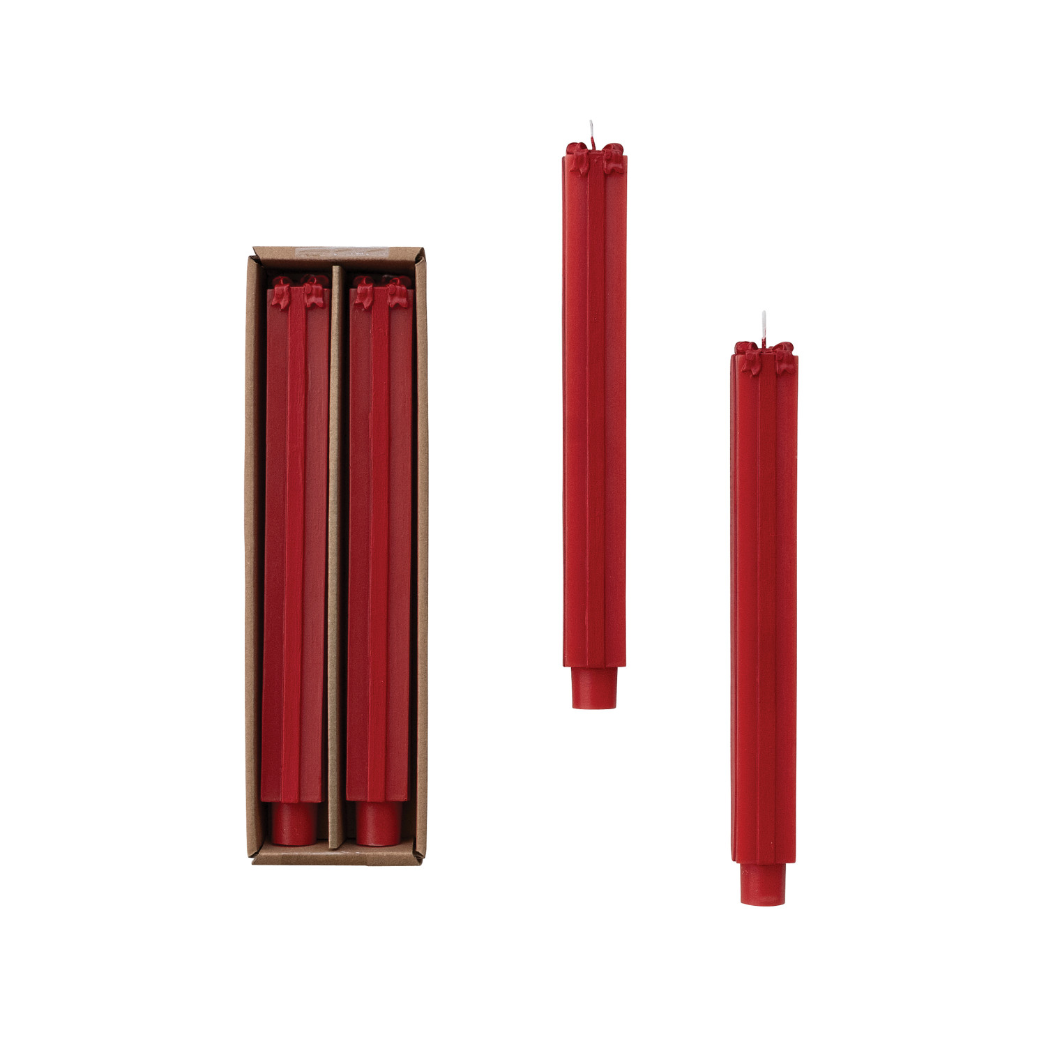 Catalog Name: 10"H Unscented Package Shaped Taper Candles in Box, Red, Set of 2 (Est. Burn Time 15 Hours)