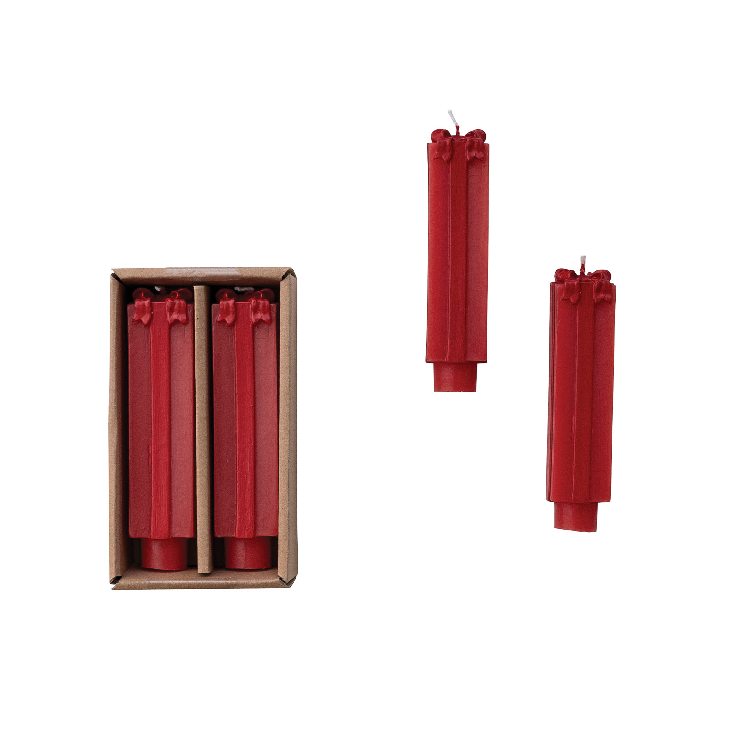Catalog Name: 4-3/4"H Unscented Package Shaped Taper Candles in Box, Red, Set of 2 (Est. Burn Time 6 Hours)