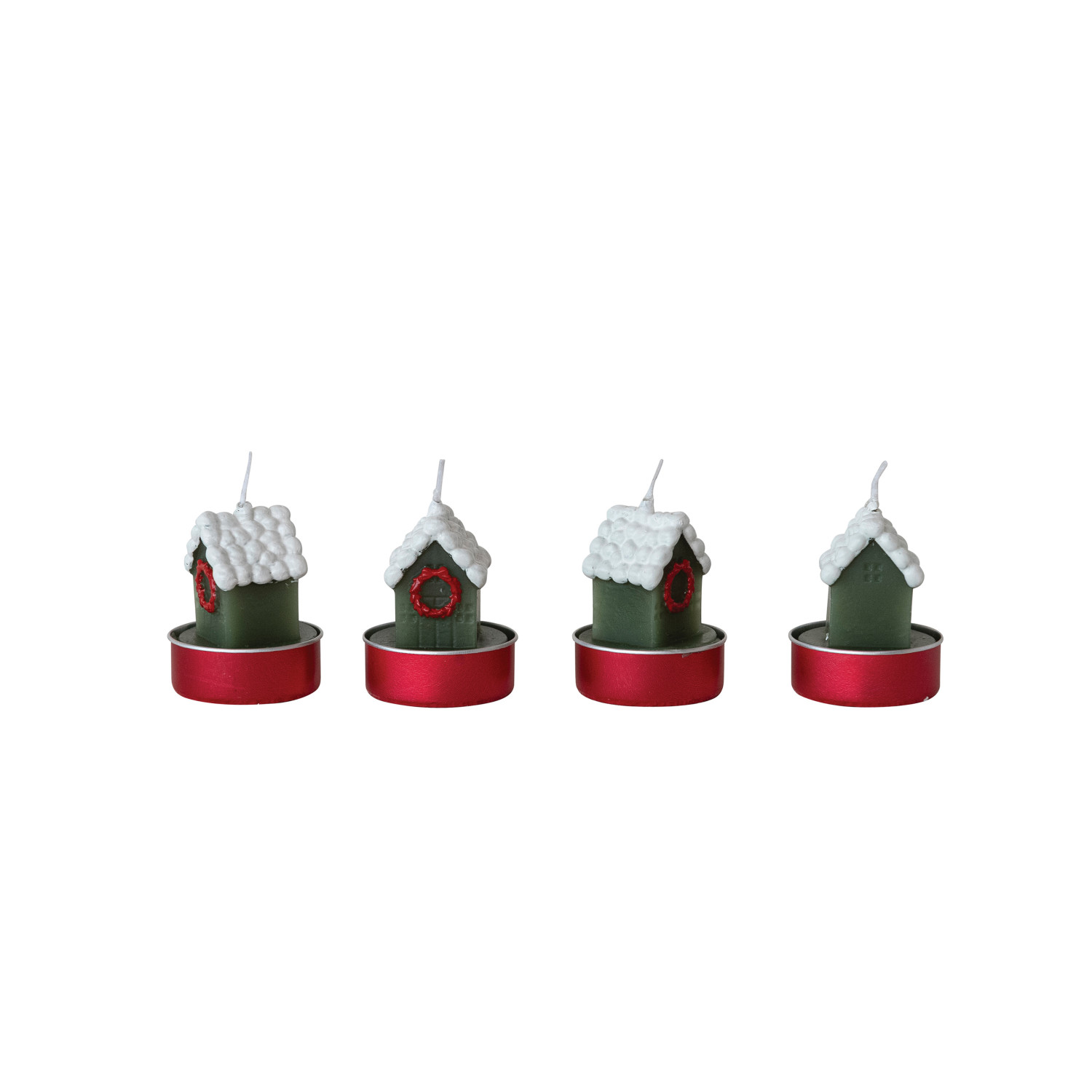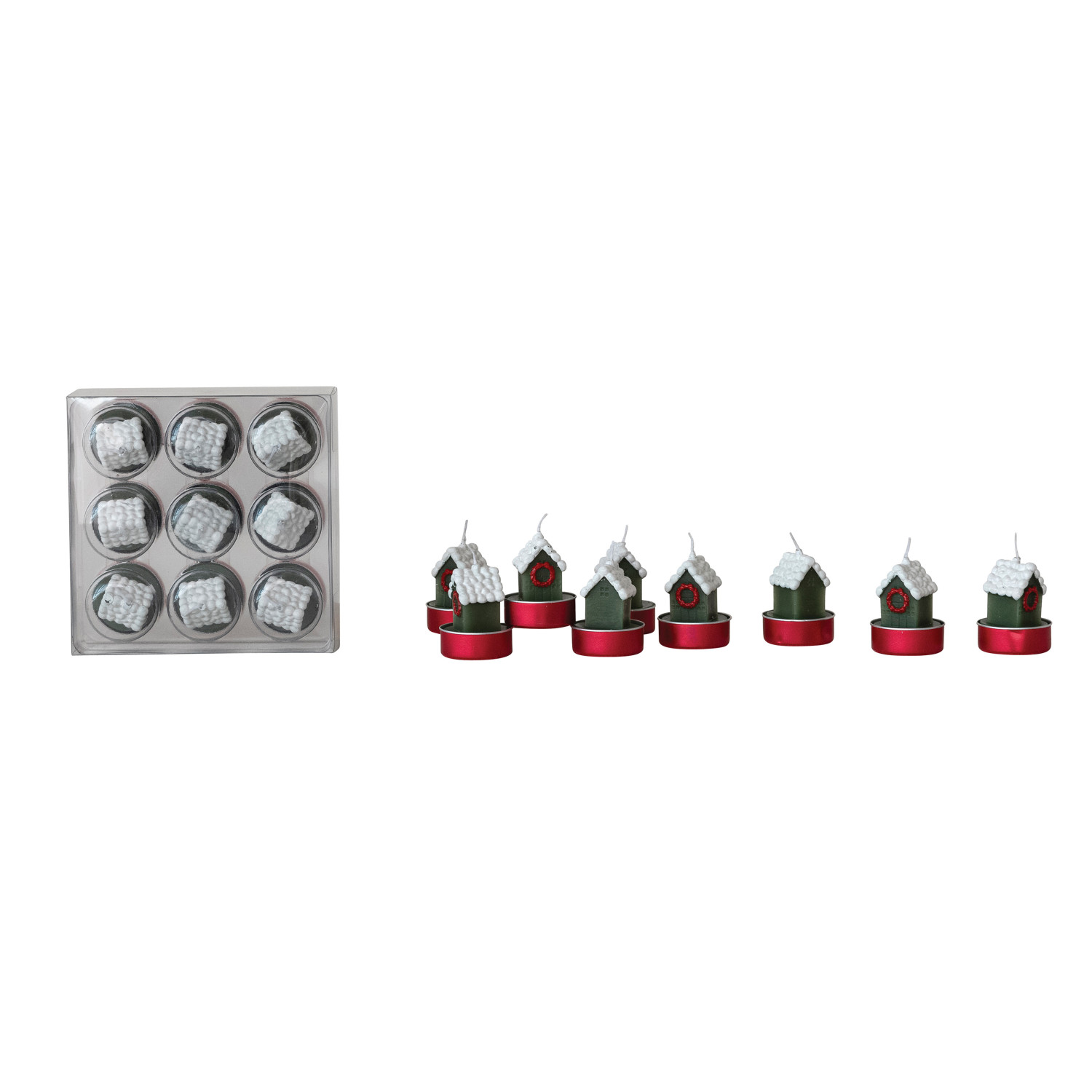 Catalog Name: 1-3/4"H Unscented House w/ Snow & Wreath Shaped Tealights in Box, White, Green & Red, Set of 9 (Est. Burn Time 4 Hours)