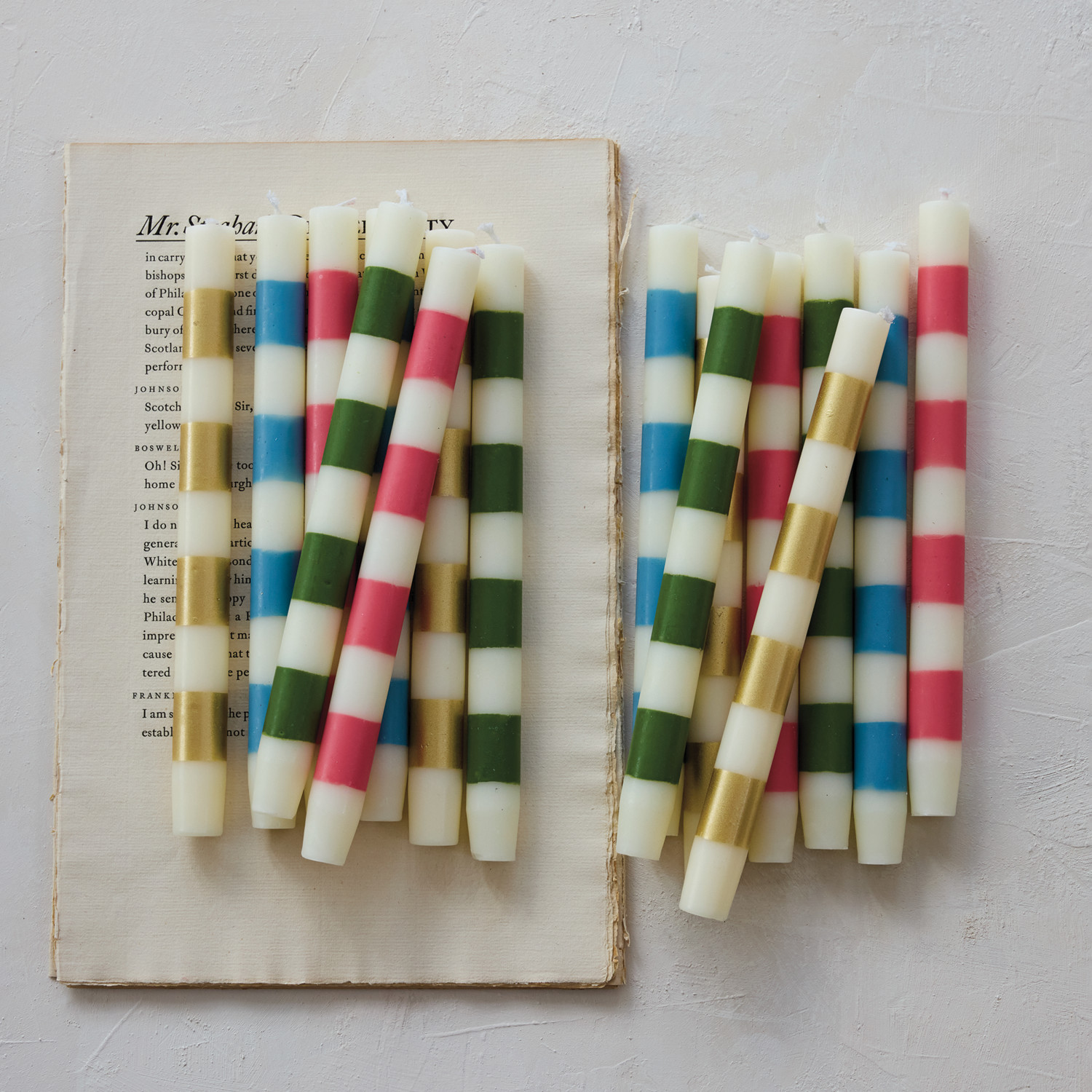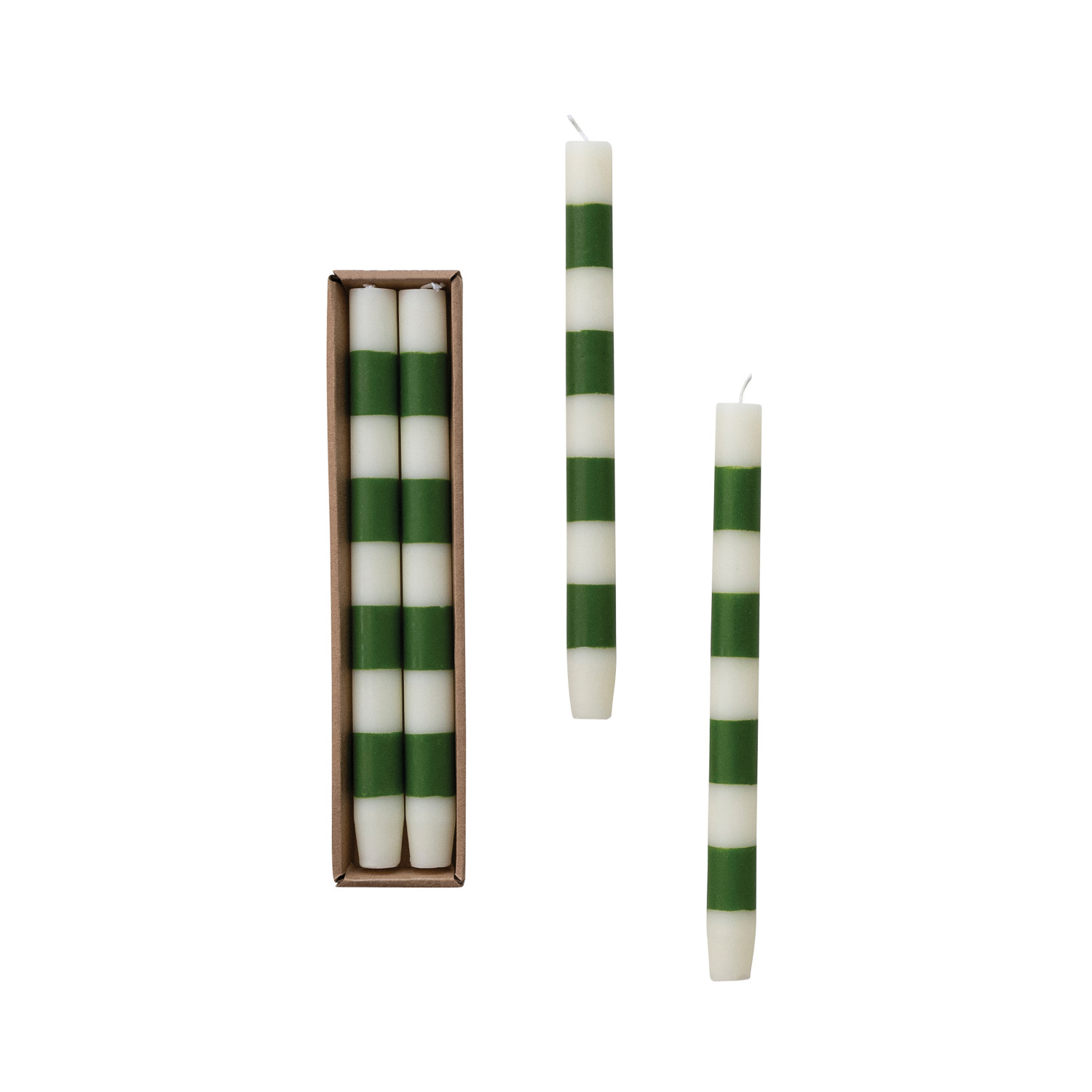 Unscented Taper Candles with Stripes in Box & Green, Set of 2 (Est. Burn Time 10 Hours)