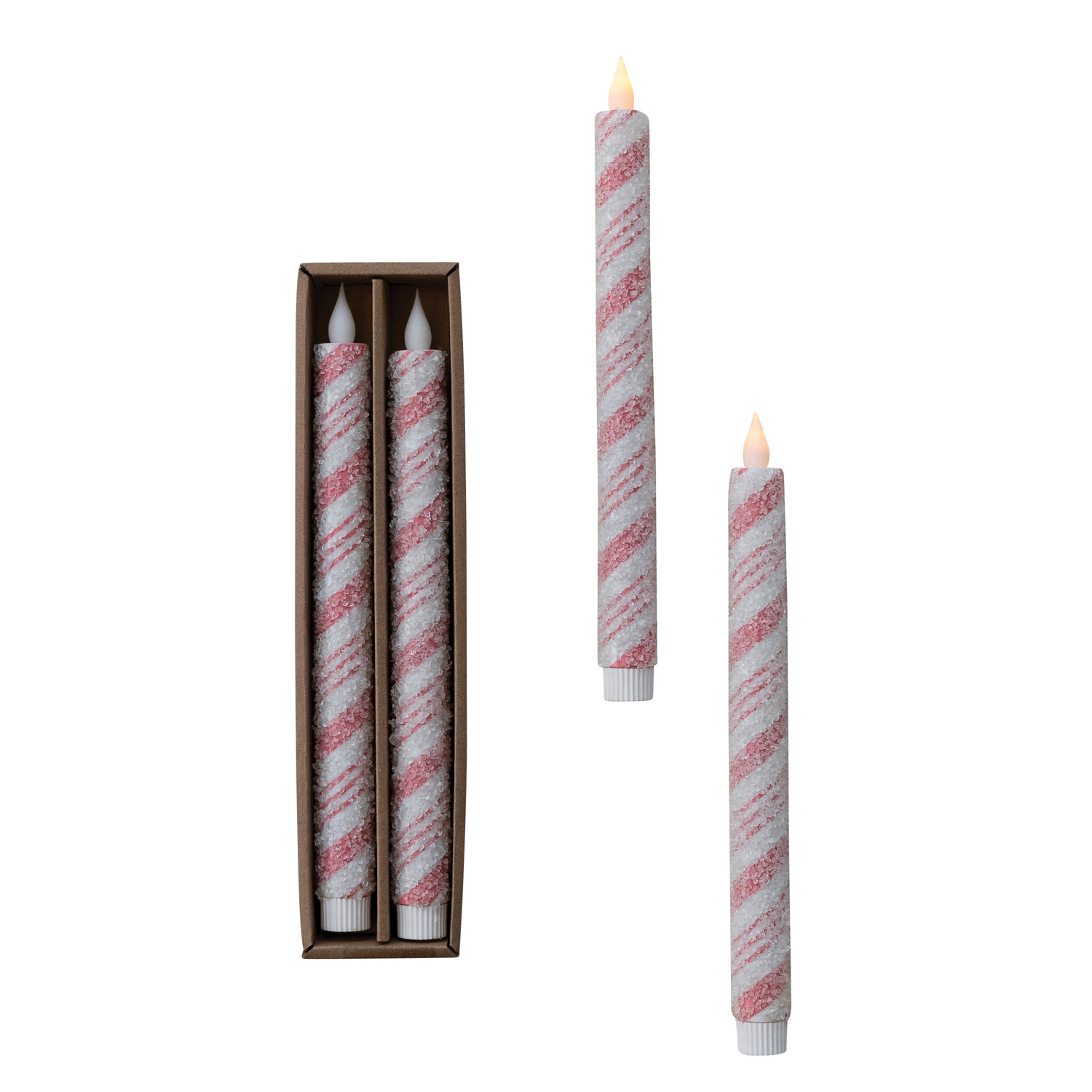 Catalog Name: 3/4" Round x 10-1/2"H Flameless LED Taper Candles w/ Candy Cane Stripes & 6 Hour Timer in Box, Pink & White w/ Sugar, Set of 2 (Requires 2-AA Batteries)