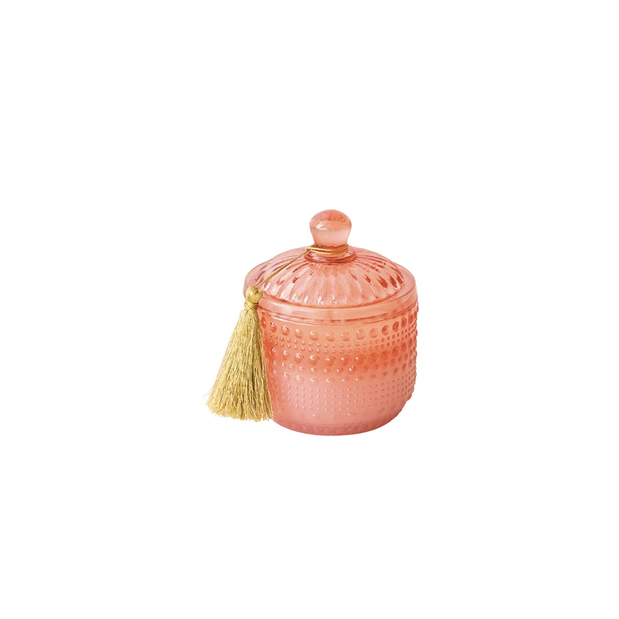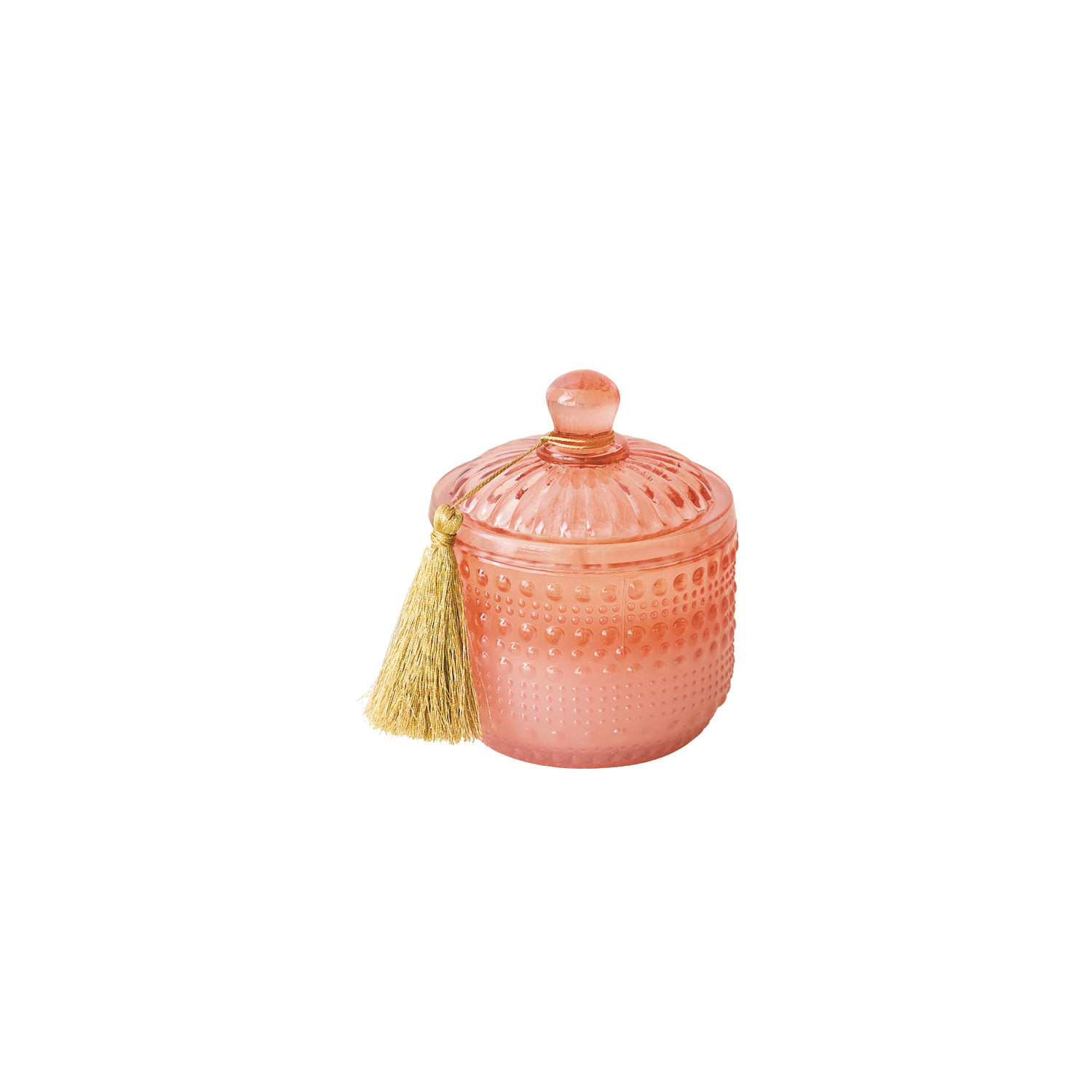 9.5 oz. Embossed Glass Winter Berry Scented Jar Candle with Lid & Gold Color Tassel, Pink