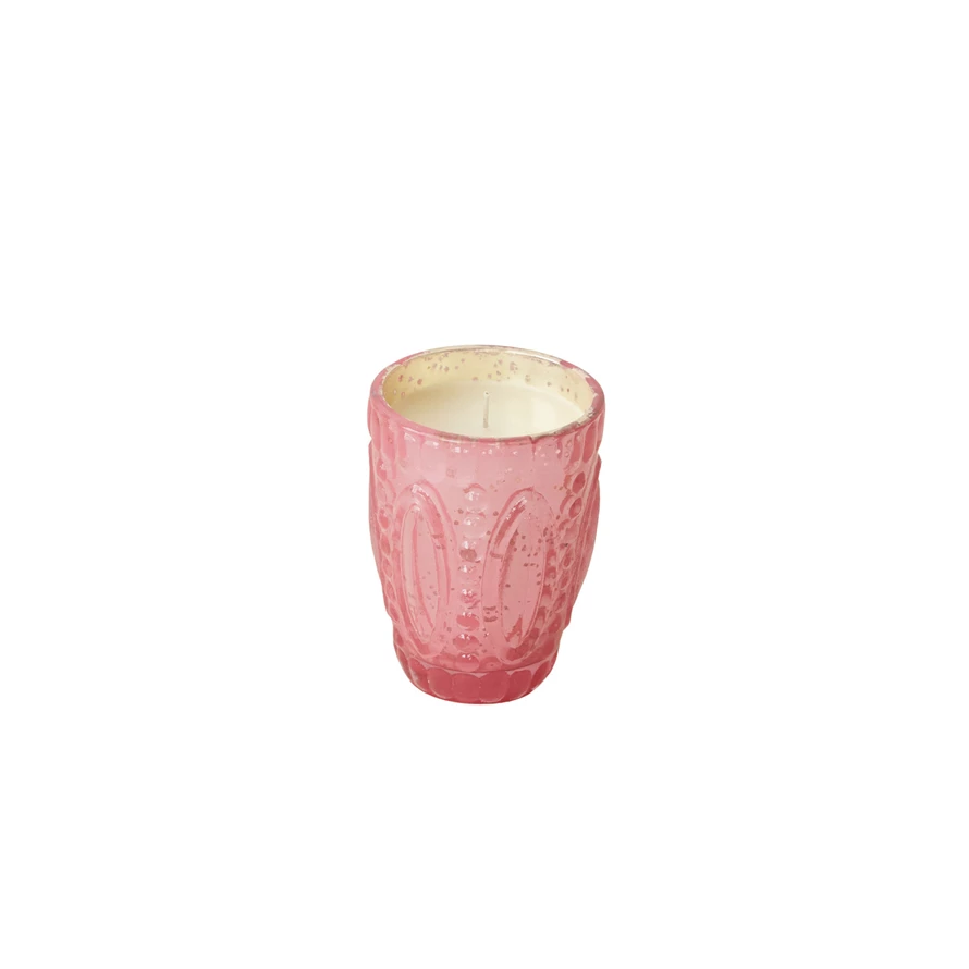 Catalog Name: 3-1/4" Round x 4-1/2"H 8.6 oz. Embossed Mercury Glass Winter Berry Scented Votive Candle, Pink