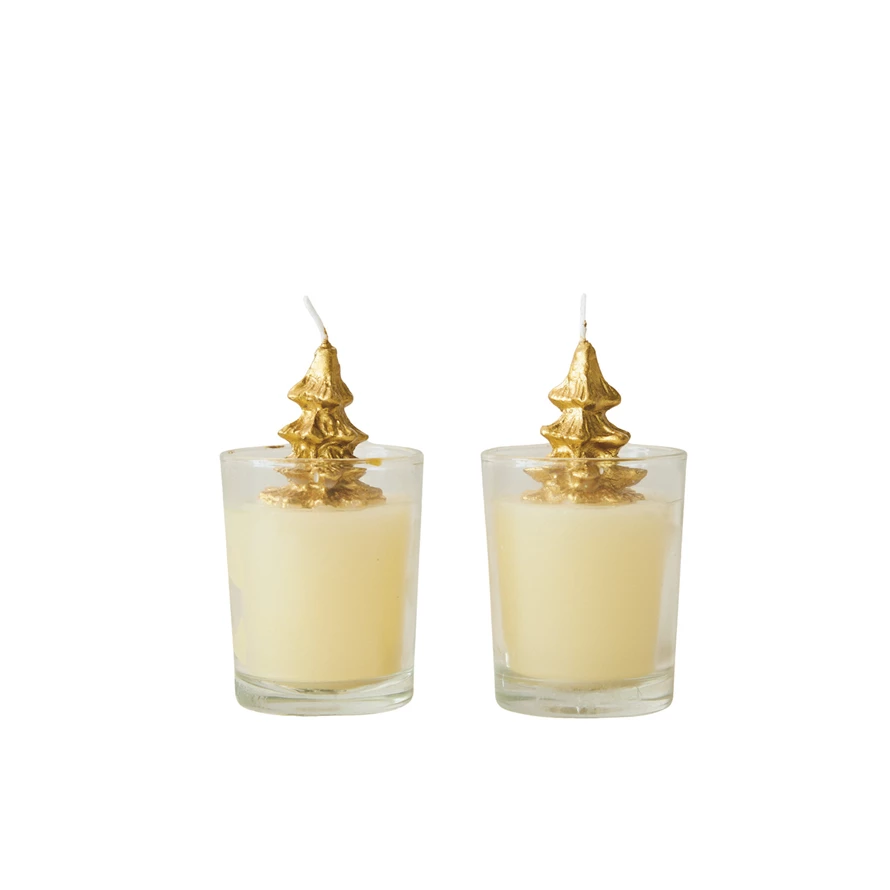Catalog Name: 2" Round x 3-1/2"H Unscented Tree Candle in Glass Vessel, Gold & Cream Color (Est. Burn Time 15 Hours)