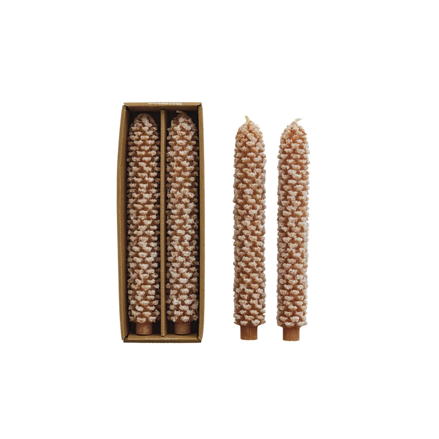 Catalog Name: 10"H Unscented Pinecone Shaped Taper Candles in Box, Snow Finish, Wheat Color, Set of 2 (Est. Burn Time 15 Hours)