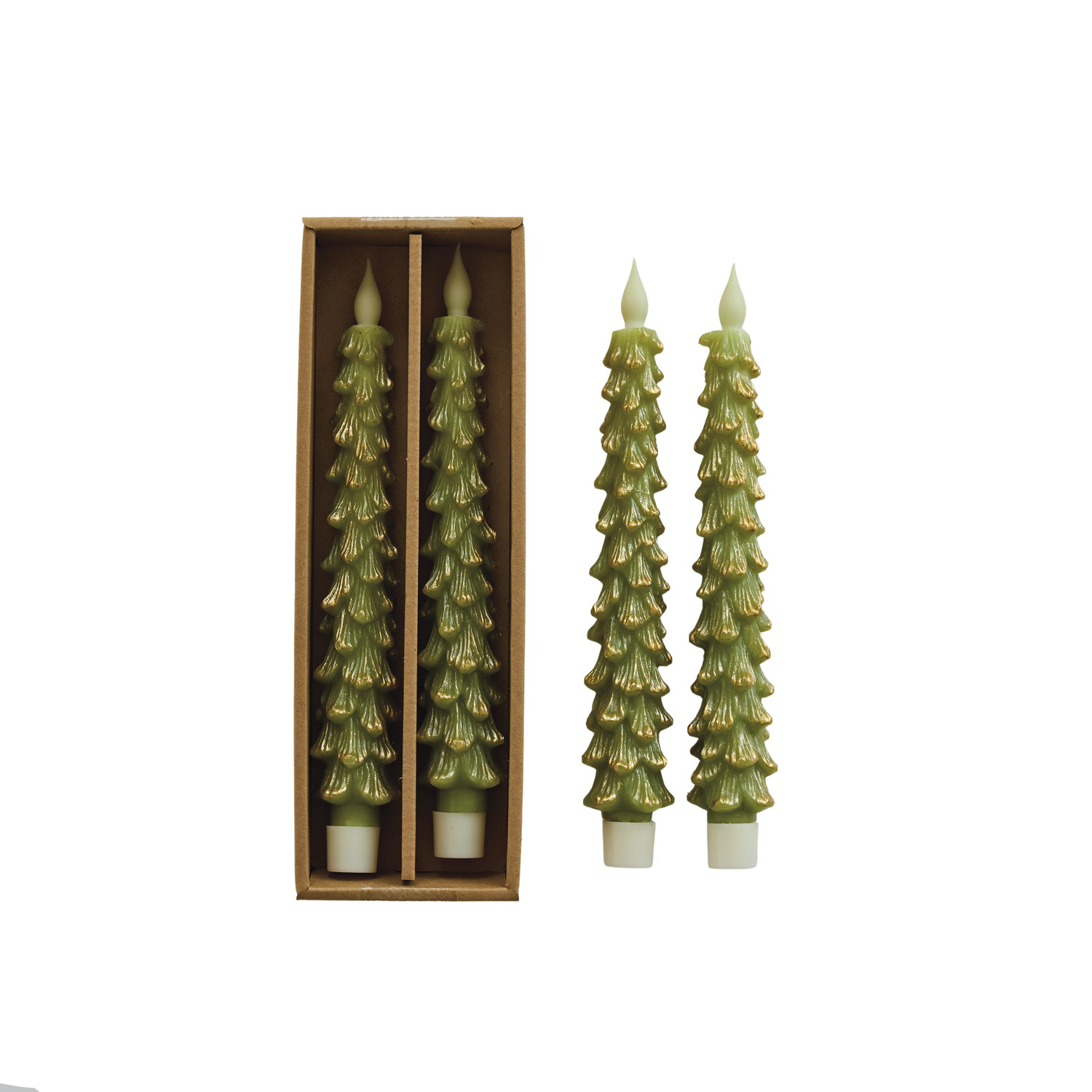 Catalog Name: 9-3/4"H Flameless LED Tree Shaped Taper Candles w/ 6 Hour Timer & Gold Tips in Box, Green, Set of 2 (Requires 2-AA Batteries)