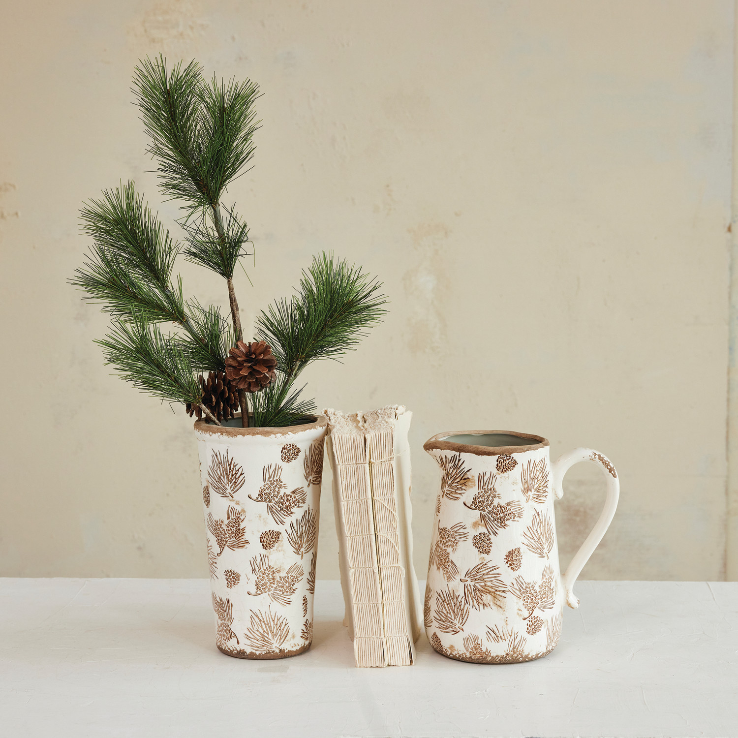 Catalog Name: 8-1/2"L x 6"W x 9-1/4"H Decorative Stoneware Pitcher/Vase w/ Evergreen Boughs & Pinecones, Distressed Finish, Brown & White