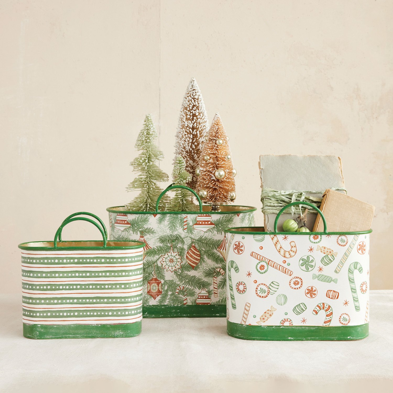 Metal Buckets with Handles & Holiday Patterns, Set of 3 ©