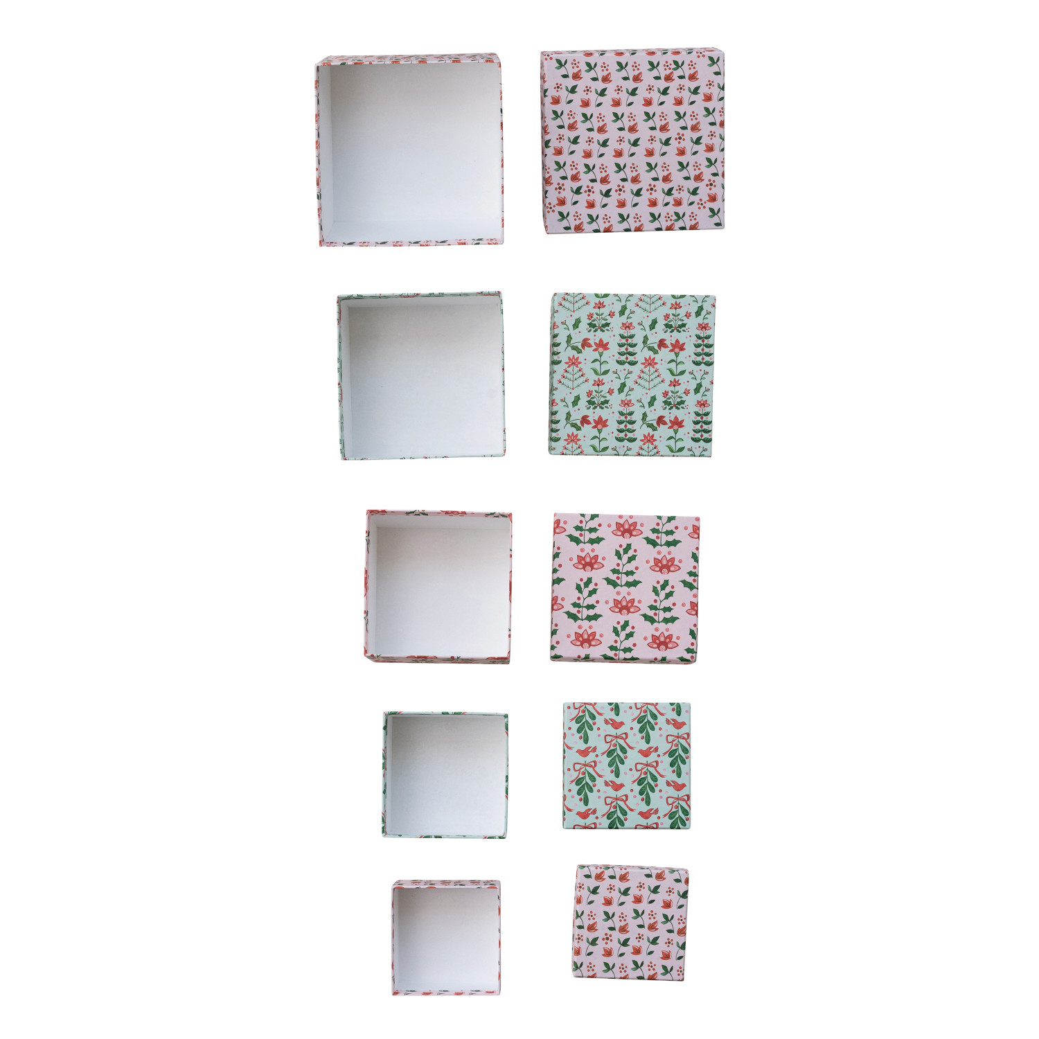 Catalog Name: 9-1/2" Square x 4"H, 8-1/2" Square x 3-1/2"H, 7-1/2" Square x 3-1/4"H, 6-1/2" Square x 3"H & 5-3/4" Square x 2-1/2"H Handmade Printed Recycled Paper Gift Boxes w/ Botanical Patterns, Multi Color, Set of 5 ©