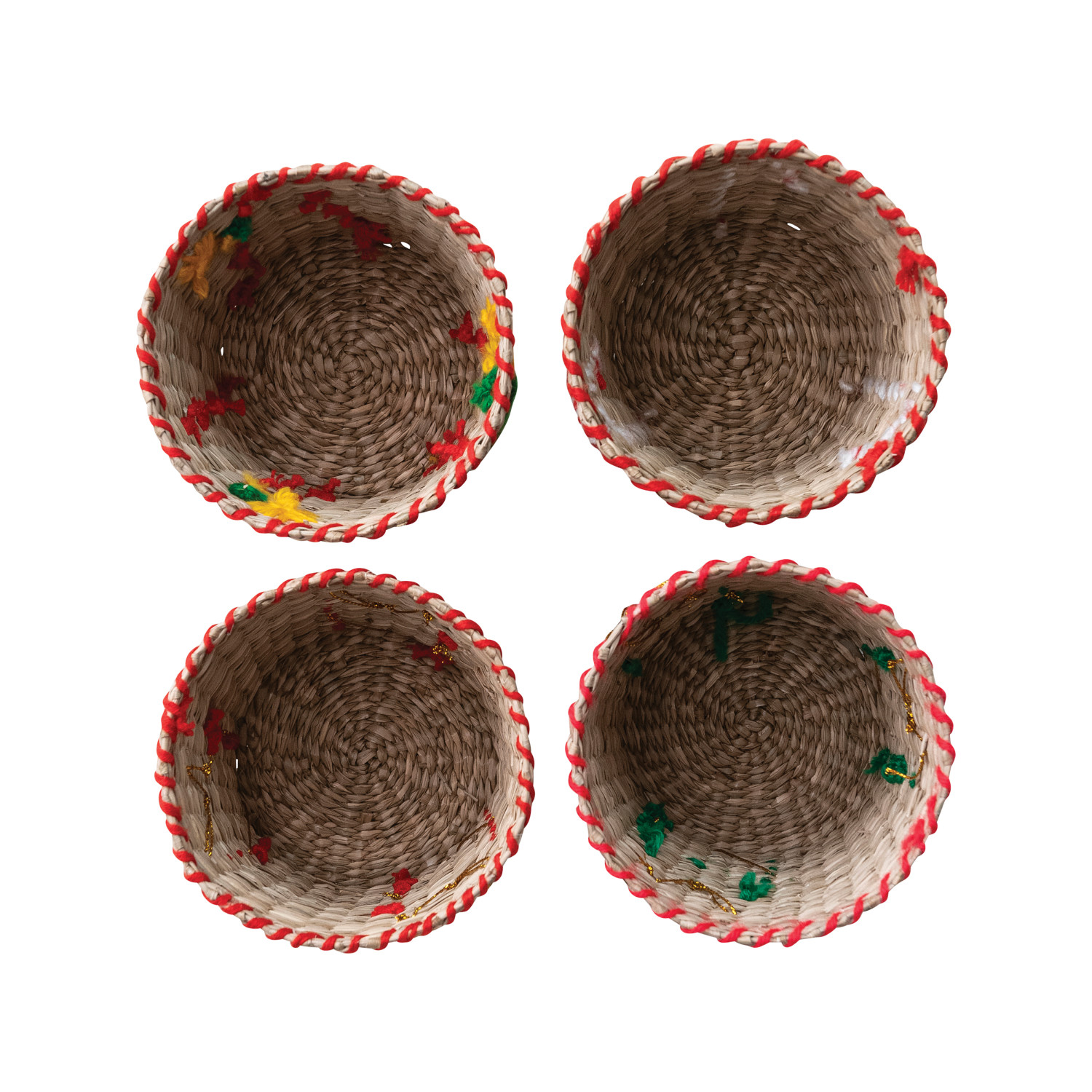 Catalog Name: 5" Round x 4"H Hand-Woven Seagrass & Cotton Basket w/ Embroidered Holiday Icon & Stitched Edge, Multi Color, 4 Styles (Each One Will Vary)