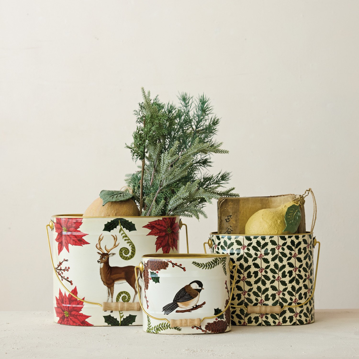 Metal Buckets with Handles & Seasonal Botanicals/Animals, Set of 3 ©