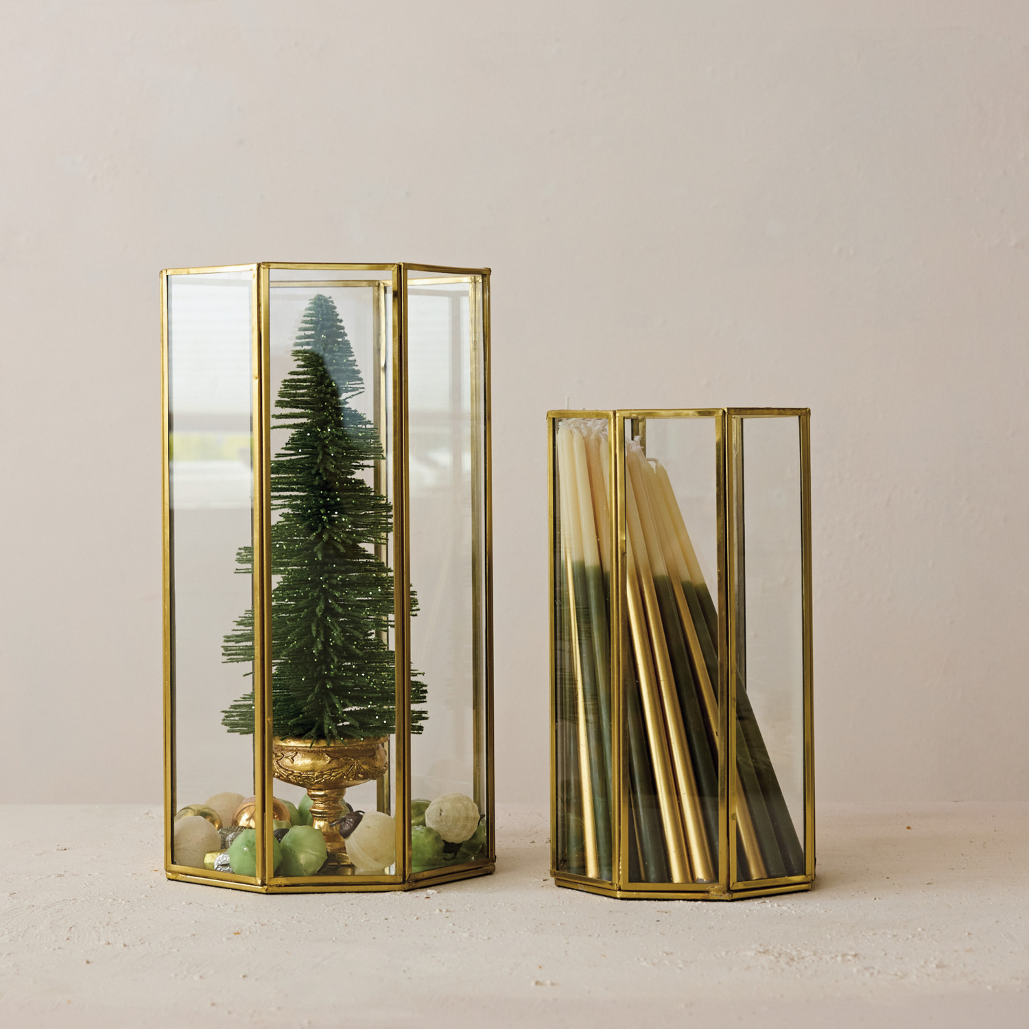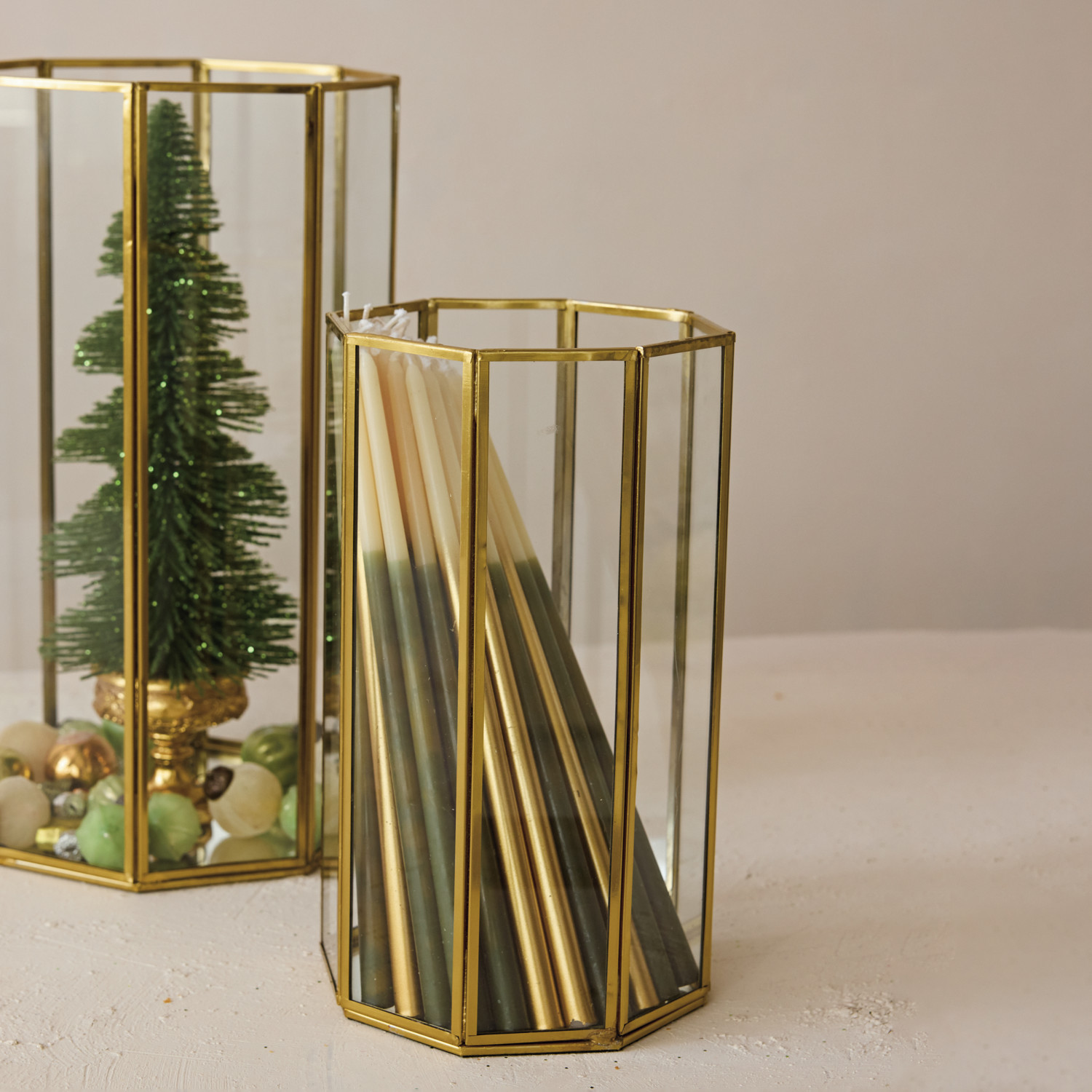 Glass & Brass Octagon Shaped Candle Holder/Container with Mirrored Bottom, Antique Finish