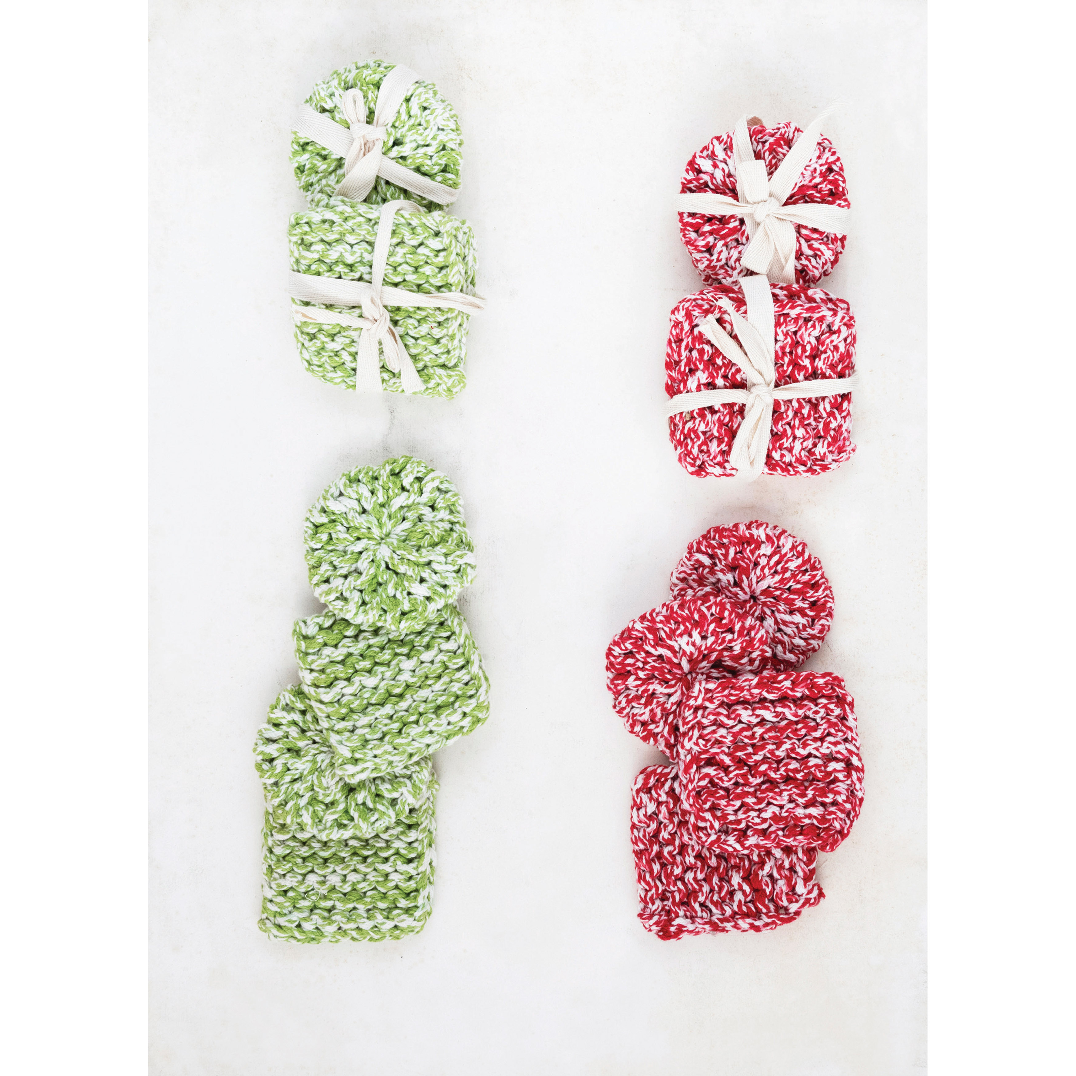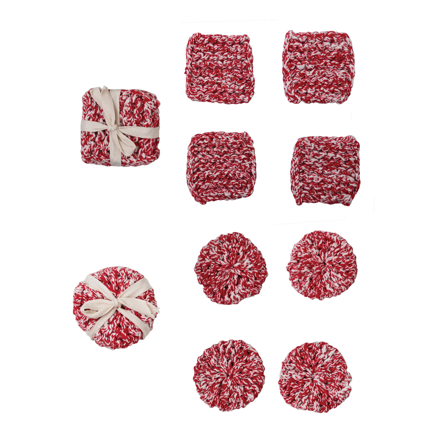 4" Round and 4" Square Melange Cotton Crocheted Coasters, Red, Set of 4, 2 Styles