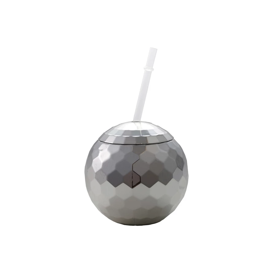 Catalog Name: 4-1/4" Round 20 oz. Plastic Mirror Ball Cup w/ Lid & Straw, Silver Color, Set of 2