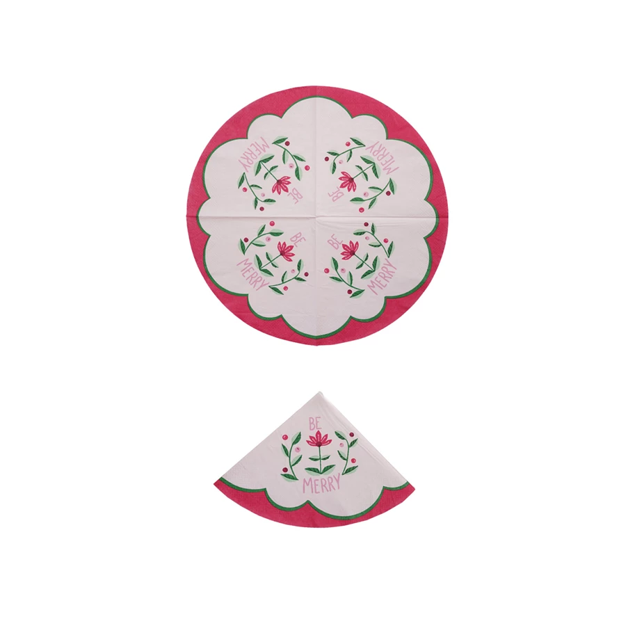 Catalog Name: 6-1/2" Round Quarter Fold Paper Napkins w/ Holiday Botanicals "Be Merry", Multi Color (Contains 50 Folded Pieces) ©