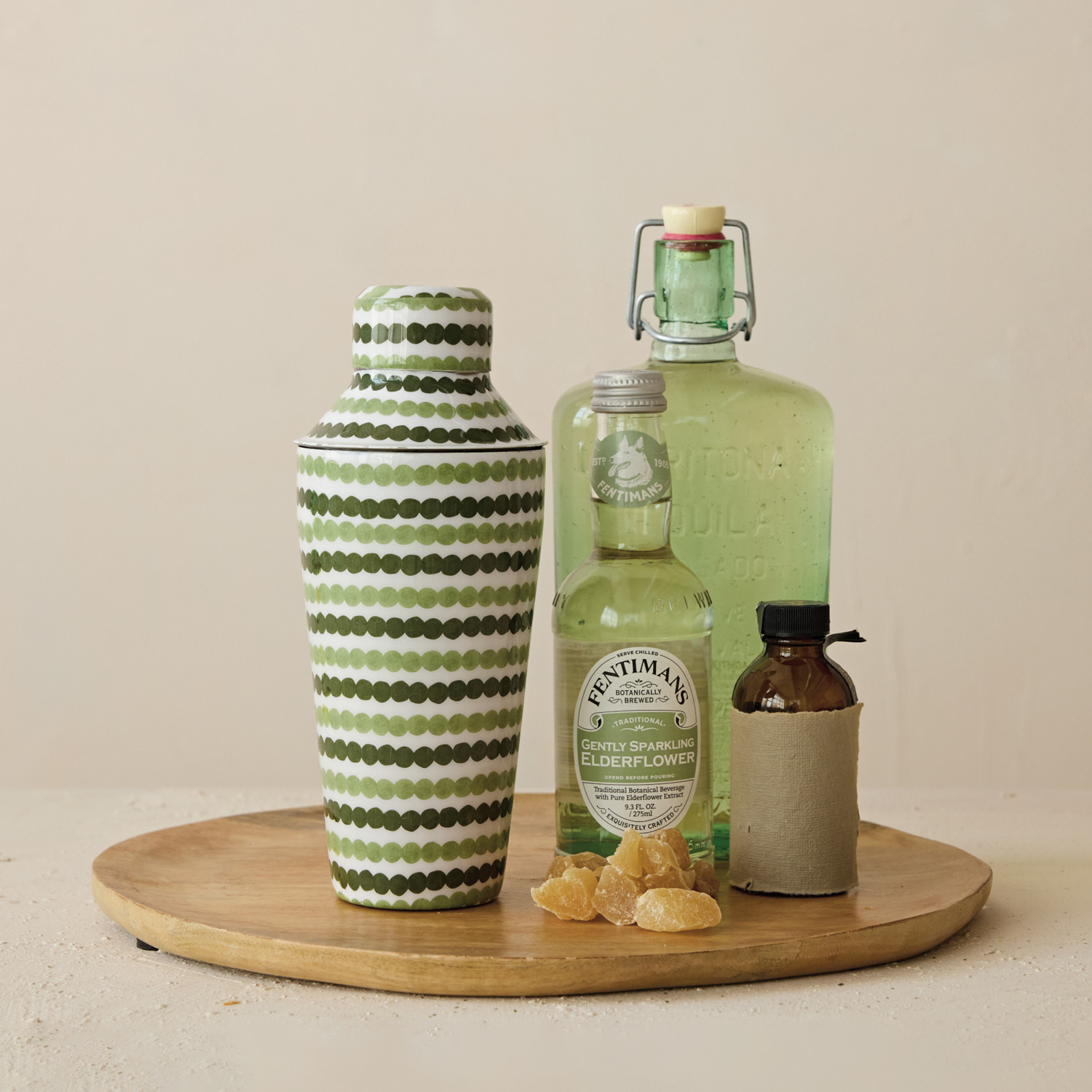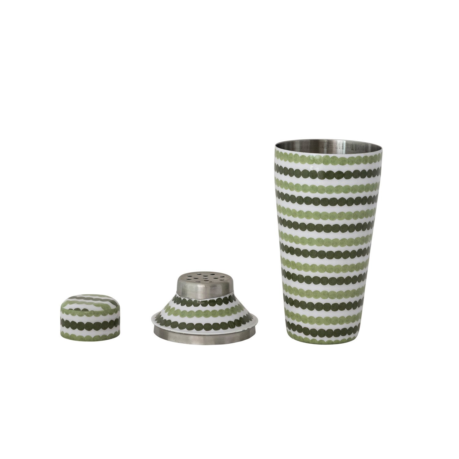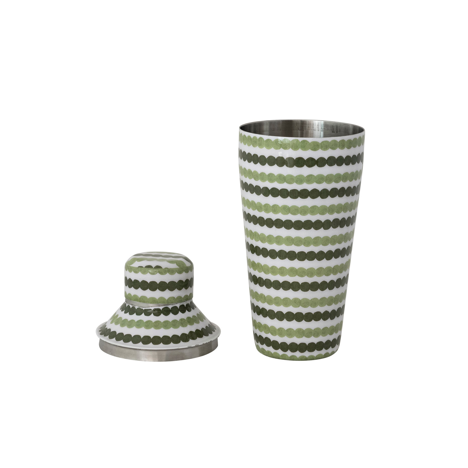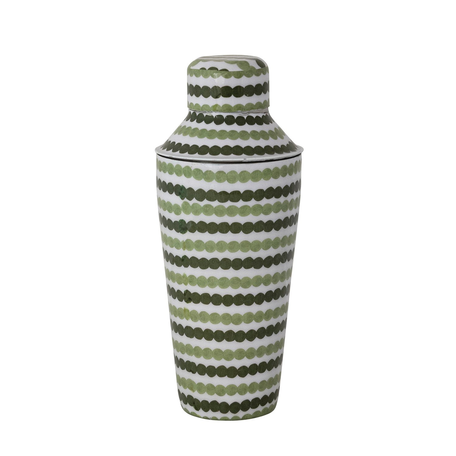 Catalog Name: 3-1/2" Round x 9"H 24 oz. Enameled Metal Cocktail Shaker w/ Dot Pattern, Green & Cream Color ©
