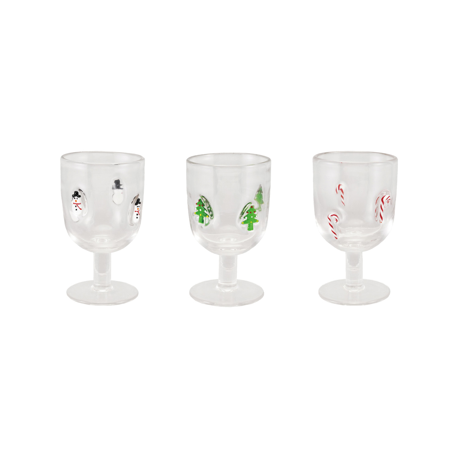 Catalog Name: 3-1/4" Round x 5-1/2"H 10 oz. Stemmed Wine Glass w/ Embedded Holiday Icons, Multi Color, 3 Styles