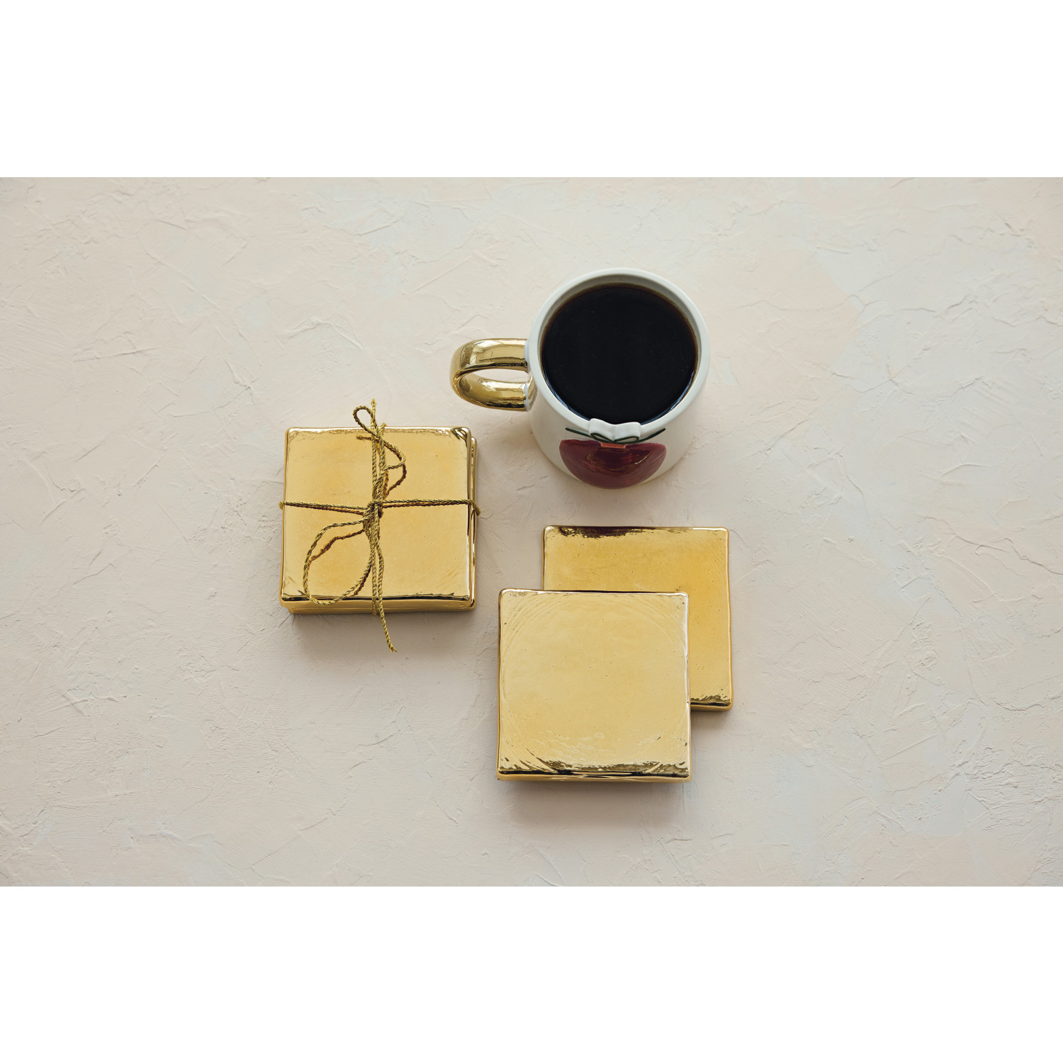 Glass Coasters, Gold Finish, Set of 4 Tied with Gold Cord