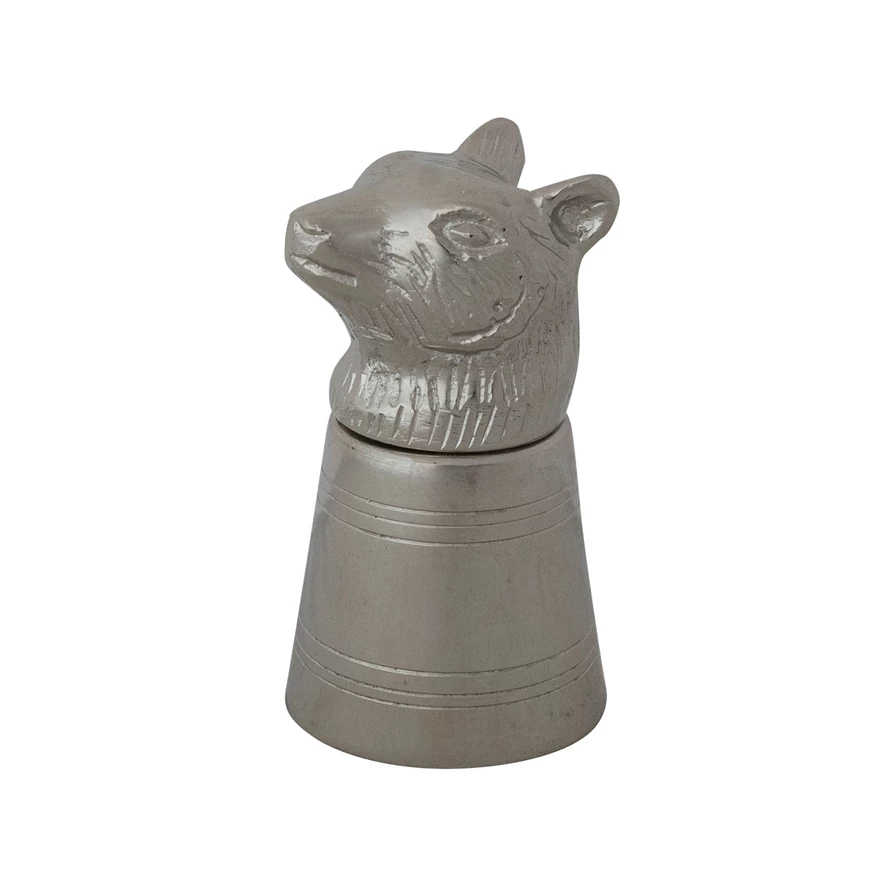 Catalog Name: 2-1/4" Round x 3-3/4"H 2 oz. Cast Aluminum & Stainless Steel Bear Head Jigger in Kraft Box, Nickel Finish