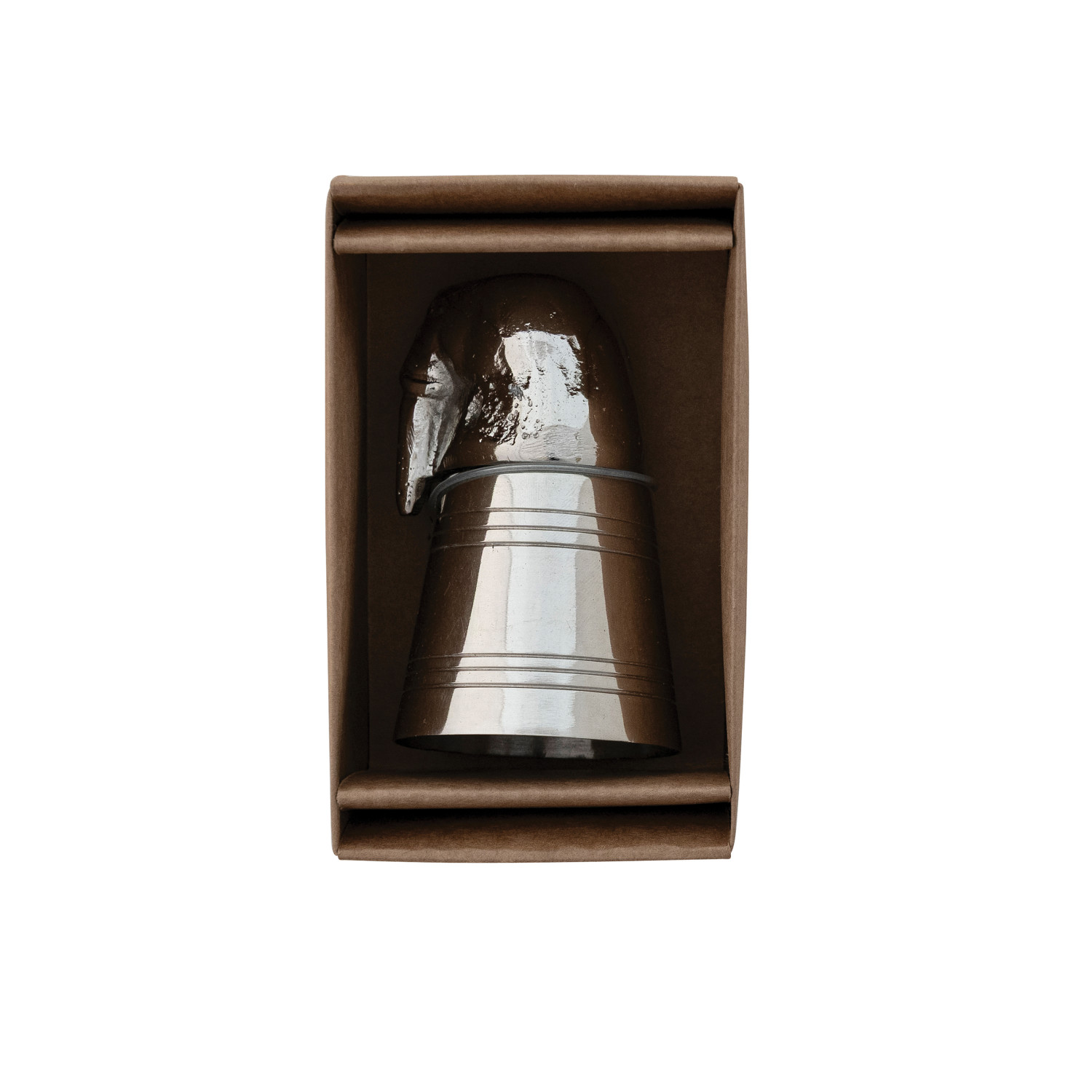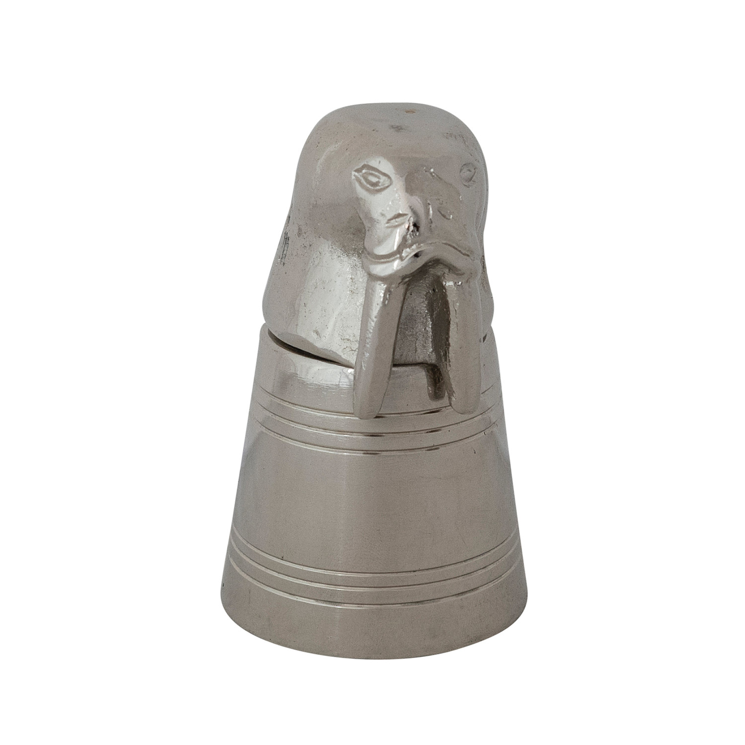 Catalog Name: 2-1/4" Round x 3-3/4"H 2 oz. Cast Aluminum & Stainless Steel Walrus Head Jigger in Kraft Box, Nickel Finish
