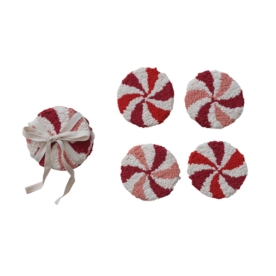 Cotton Tufted Candy Striped Coasters, Pink, Red & White, Set of 4 Tied with Cotton Tape