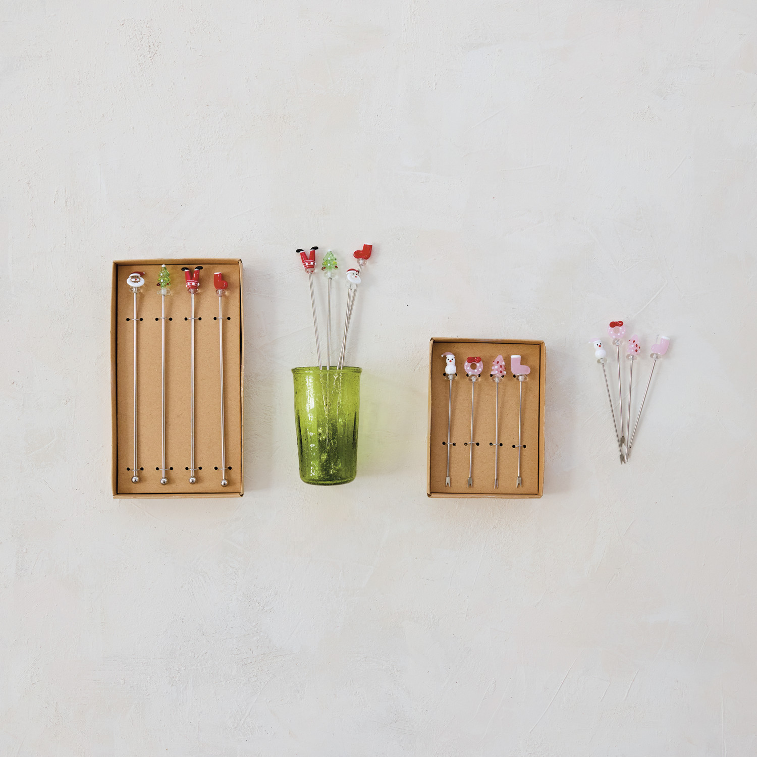 Catalog Name: 8"L Stainless Steel Cocktail Stirrers w/ Hand-Blown Glass Holiday Icons, Multi Color, Boxed Set of 4