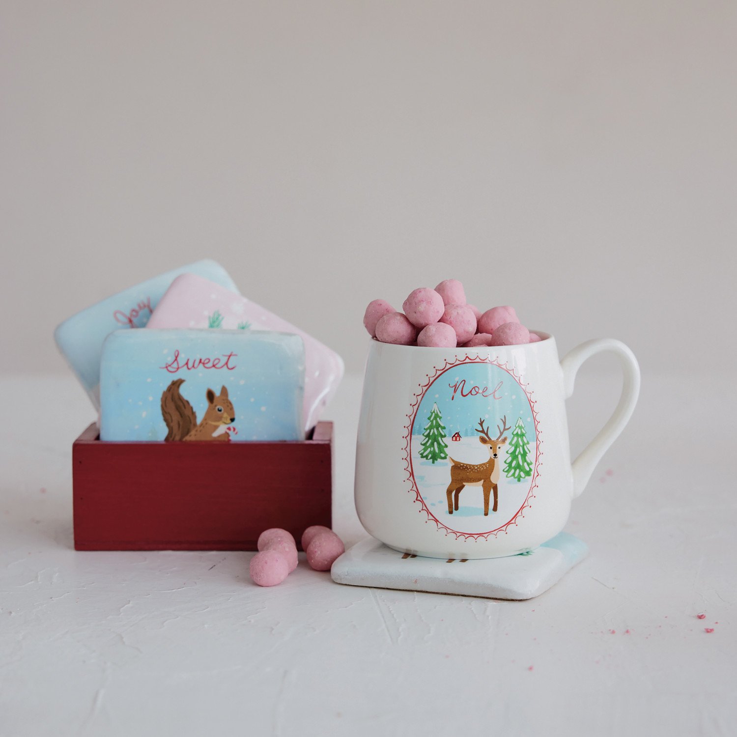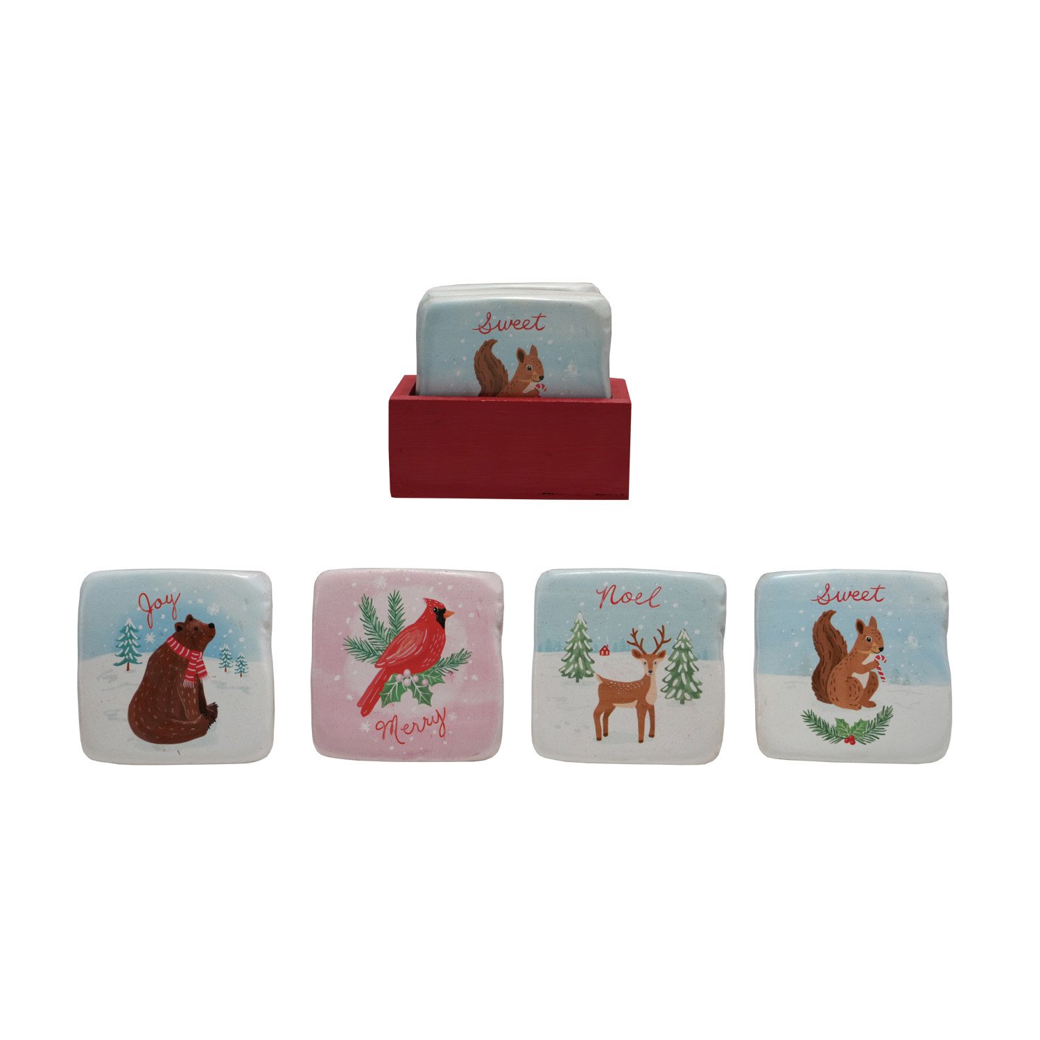 Catalog Name: 4" Square Resin Coasters w/ Holiday Words & Animals in Wood Box, Multi Color, Set of 5 ©
