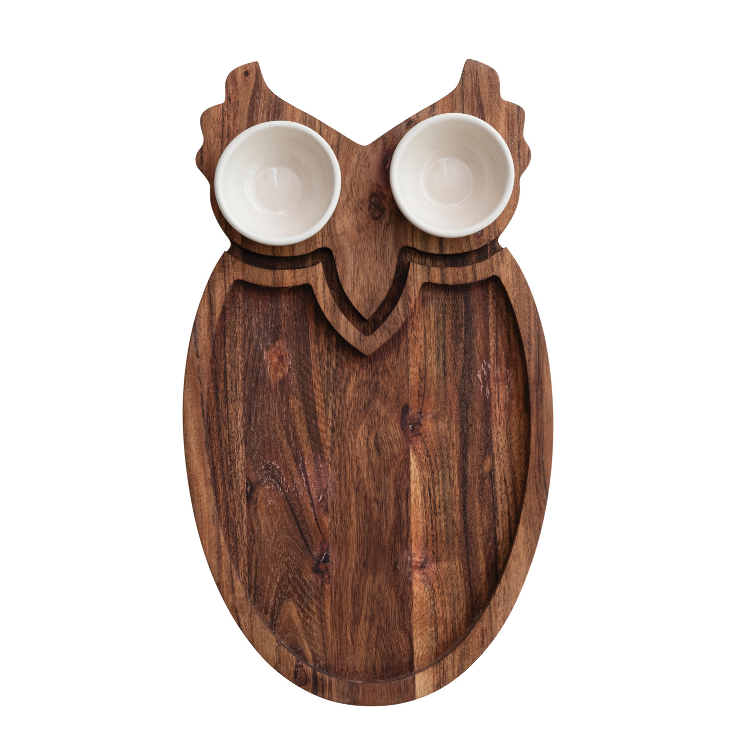 Acacia Wood Owl Shaped Platter with (2) 3" Round x 1-1/2"H Stoneware Bowls, Set of 3