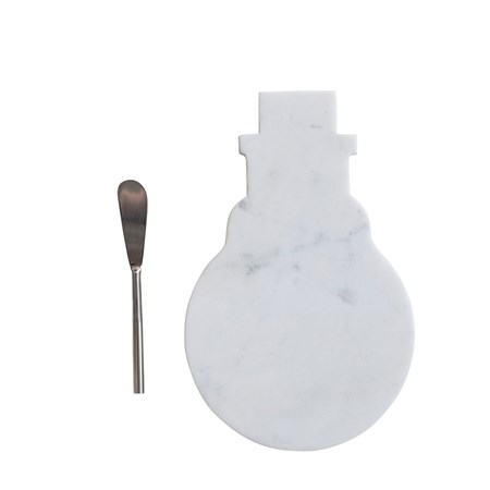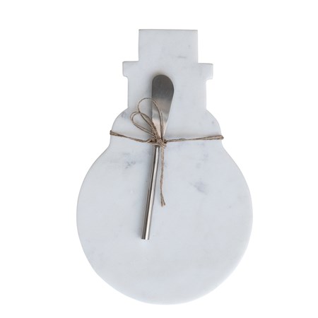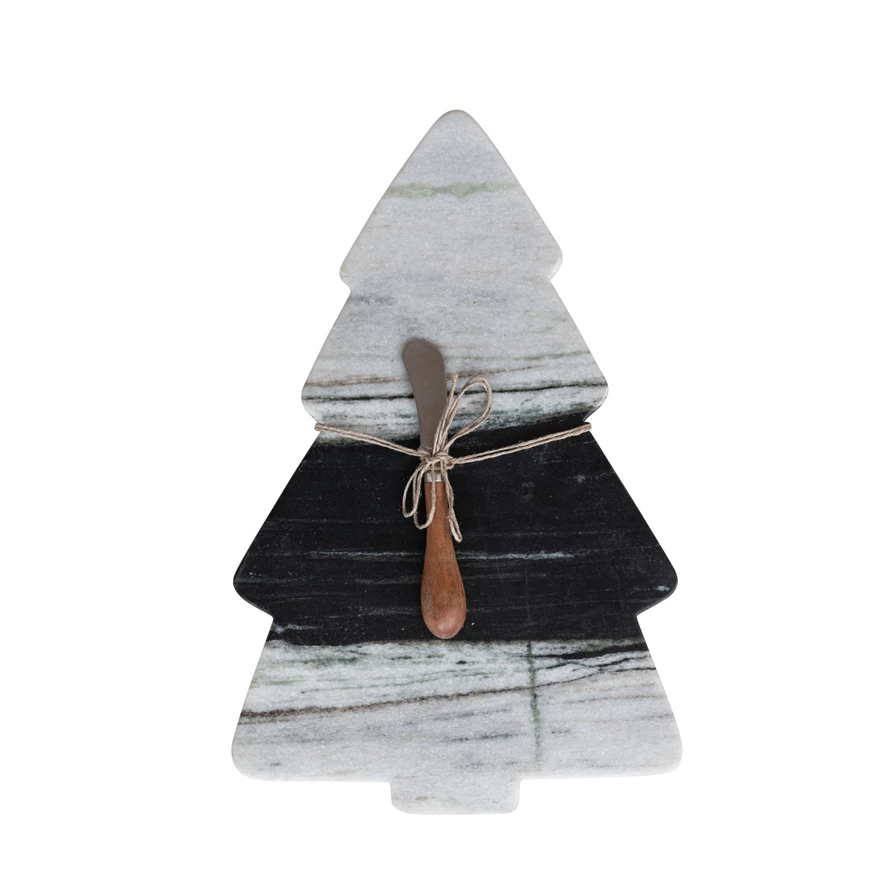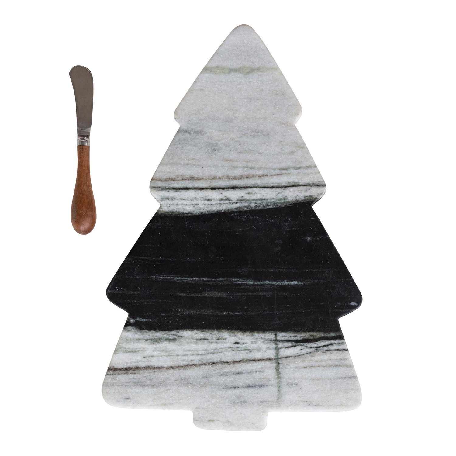 Catalog Name: 14"L x 9"W Marble Tree Shaped Cheese/Serving Board w/ Stainless Steel & Mango Wood Canape Knife, Black Melange, Set of 2 Tied w/ Jute (Each One Will Vary)