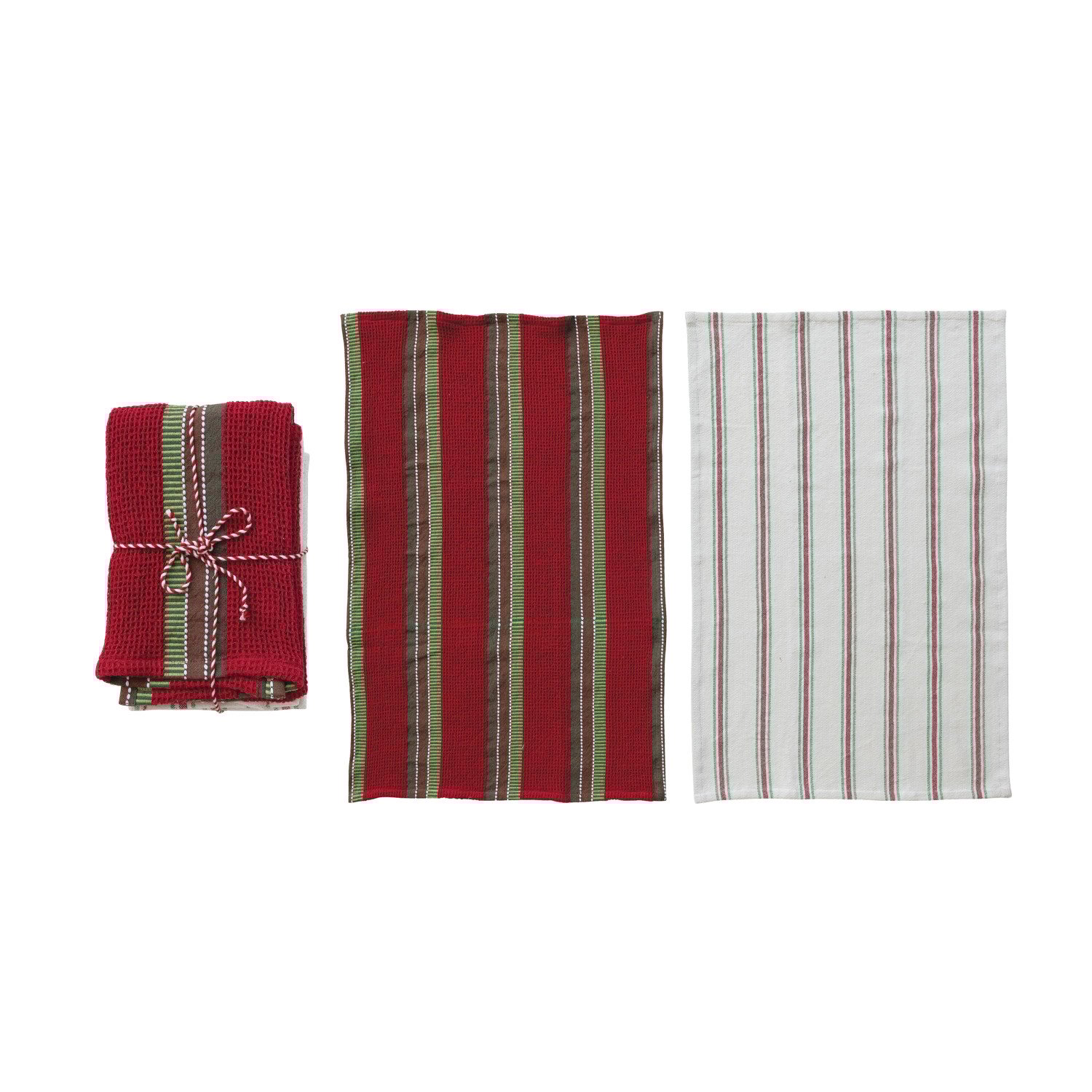 Catalog Name: 28"L x 18"W (2) Cotton Waffle Weave Striped Tea Towels & 10"L x 5"W Mango Wood Cheese/Serving Board w/ Handle, Multi Color & Natural, Set of 3 Tied w/ Red & White Cord