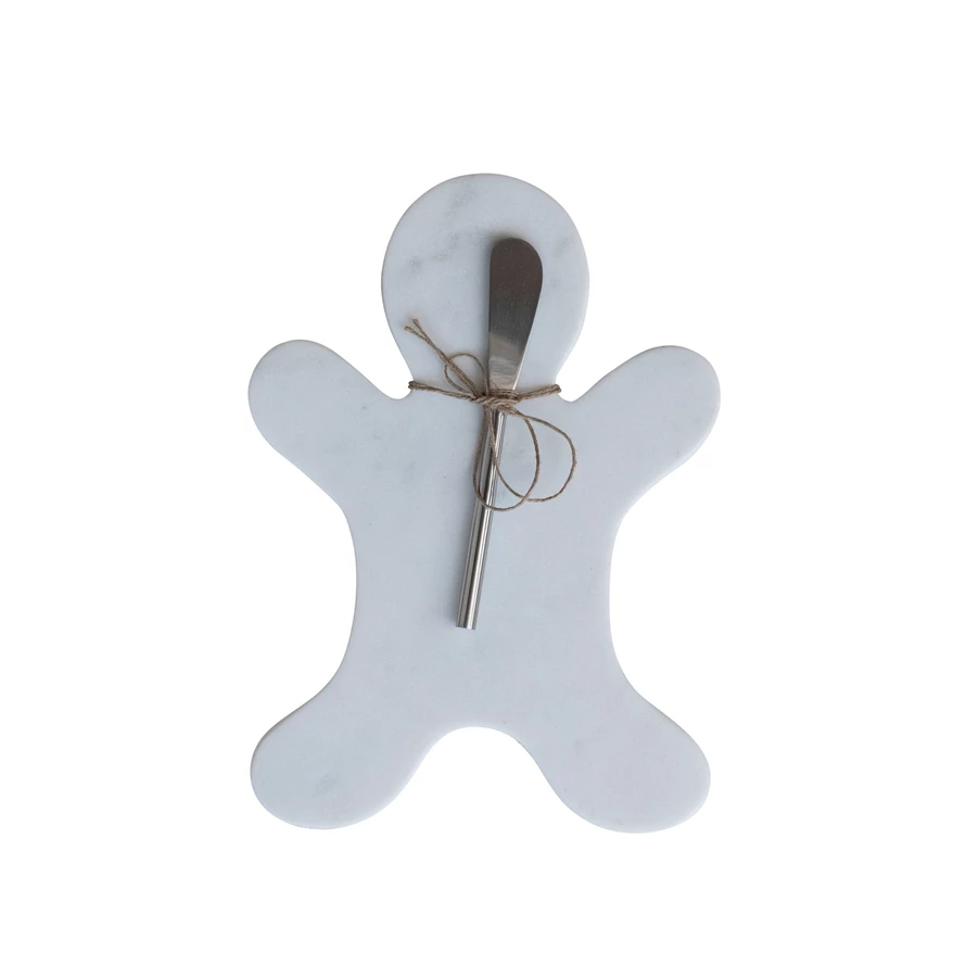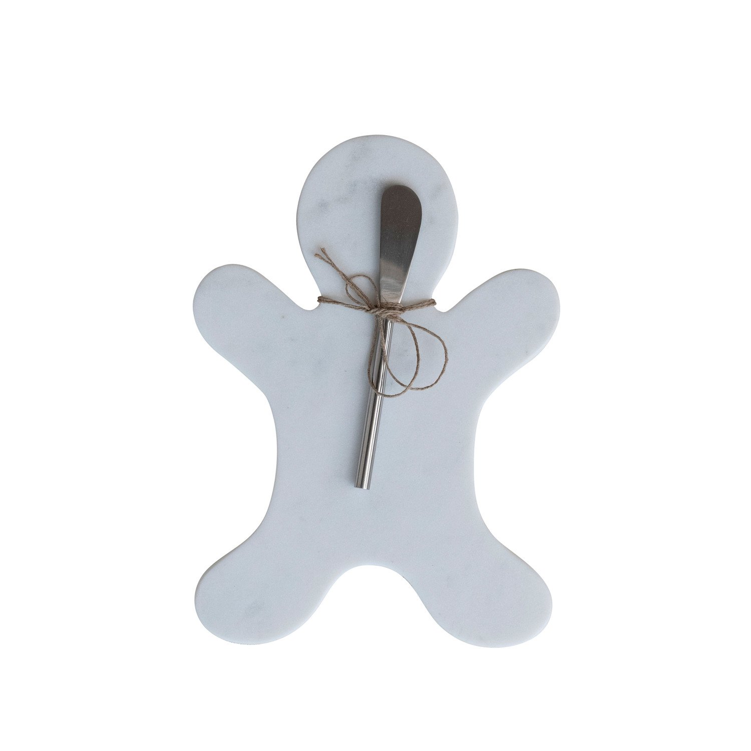Catalog Name: 11"L x 8"W Marble Gingerbread Shaped Cheese/Serving Board w/ Stainless Steel Canape Knife, White & Nickel Finish, Set of 2 Tied w/ Jute