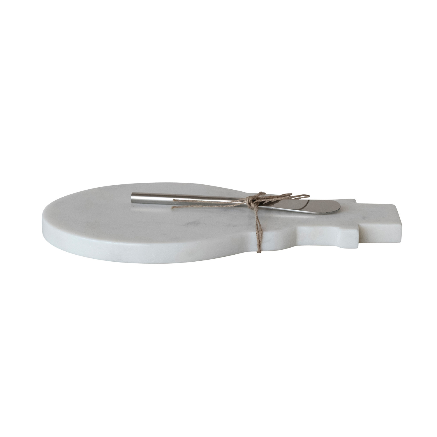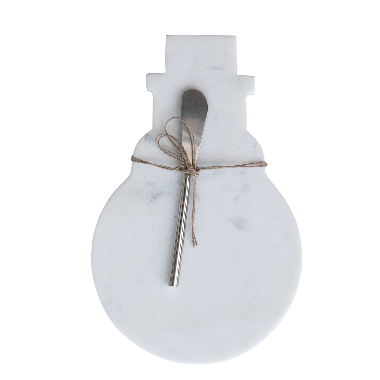 Catalog Name: 11"L x 7"W Marble Snowman Shaped Cheese/Serving Board w/ Stainless Steel Canape Knife, White & Nickel Finish, Set of 2 Tied w/ Jute