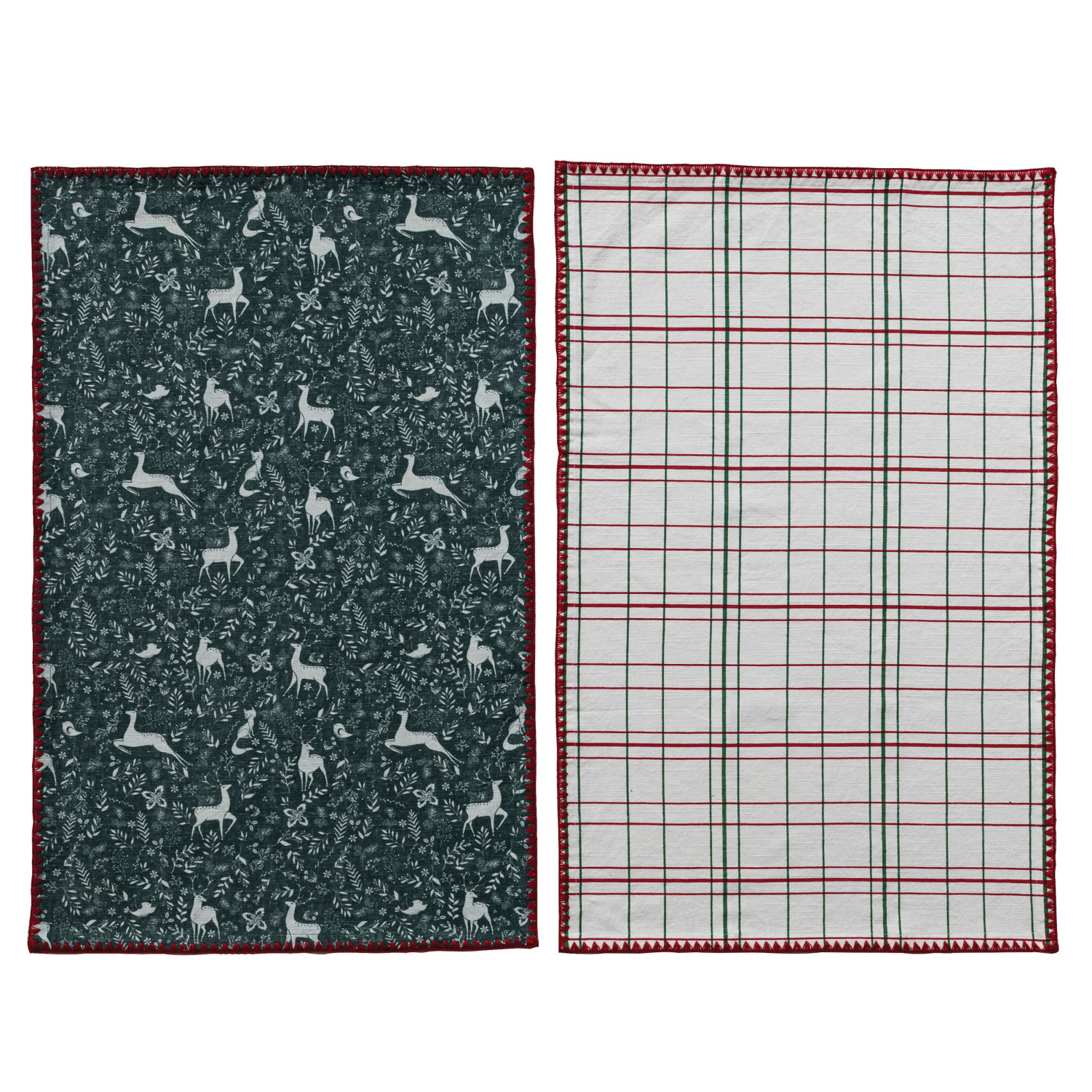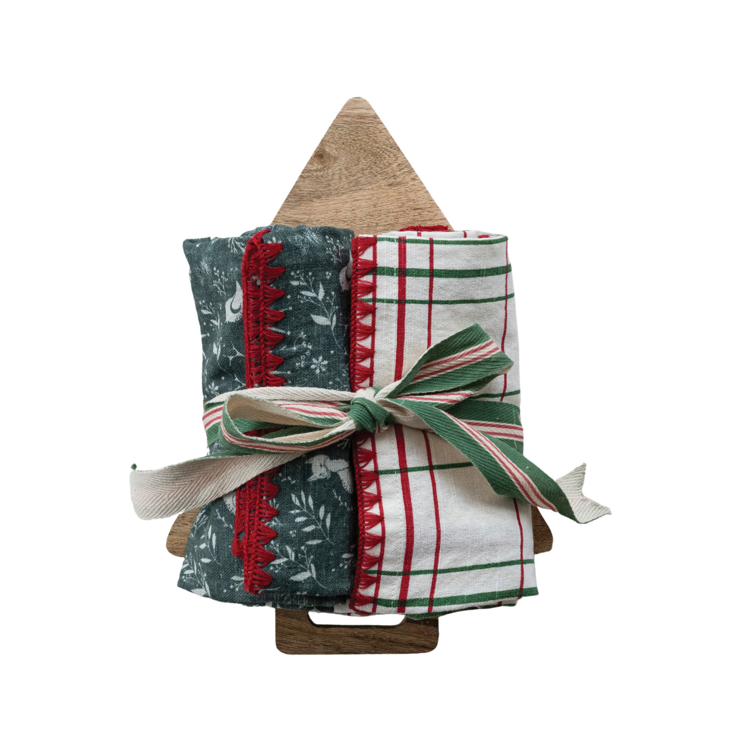 Catalog Name: 28"L x 18"W Cotton Printed Tea Towels w/ Holiday Patterns, Blanket Stitch Edge & 10"L x 7"W Mango Wood Tree Shaped Cheese/Serving Board w/ Handle, Multi Color & Natural, Set of 3 Tied w/ Striped Cotton Tape