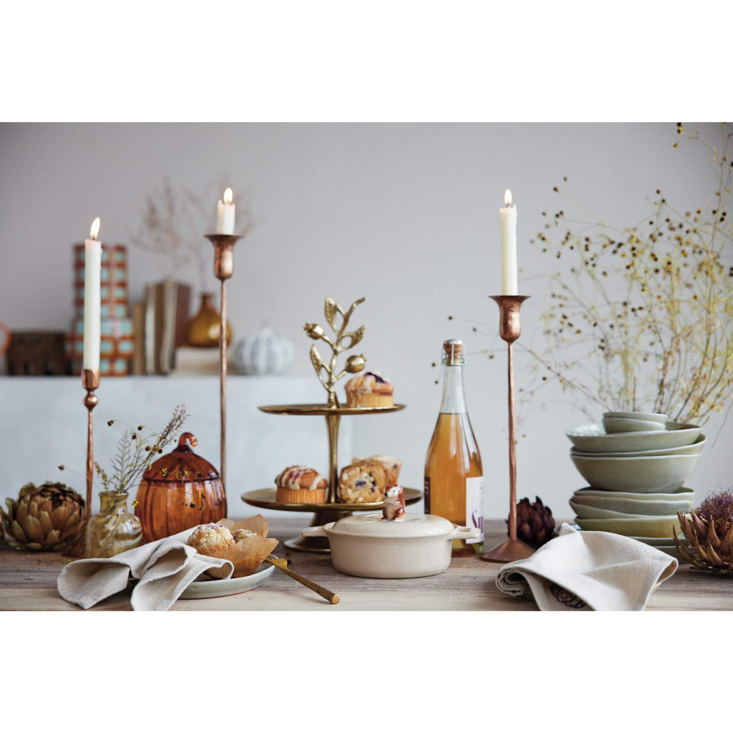 Catalog Name: 7" Round x 3"H 2 Cup Stoneware Baker w/ Squirrel Finial & Handles, Brown & Beige