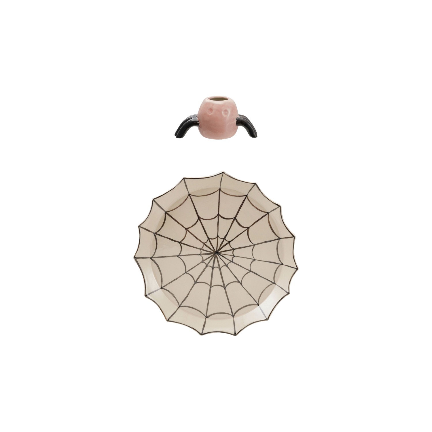 Catalog Name: 11" Round Stoneware Spider Web Shaped Platter w/ 3-1/4"L Spider Shaped Toothpick Holder, Black, White & Pink, Set of 2 ©