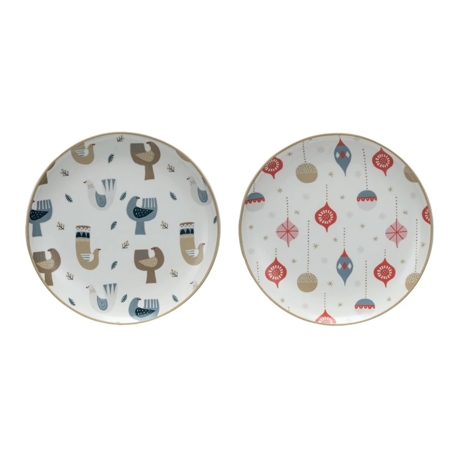 Stoneware Plate w/ Dove/Ornament Pattern, 2 Styles