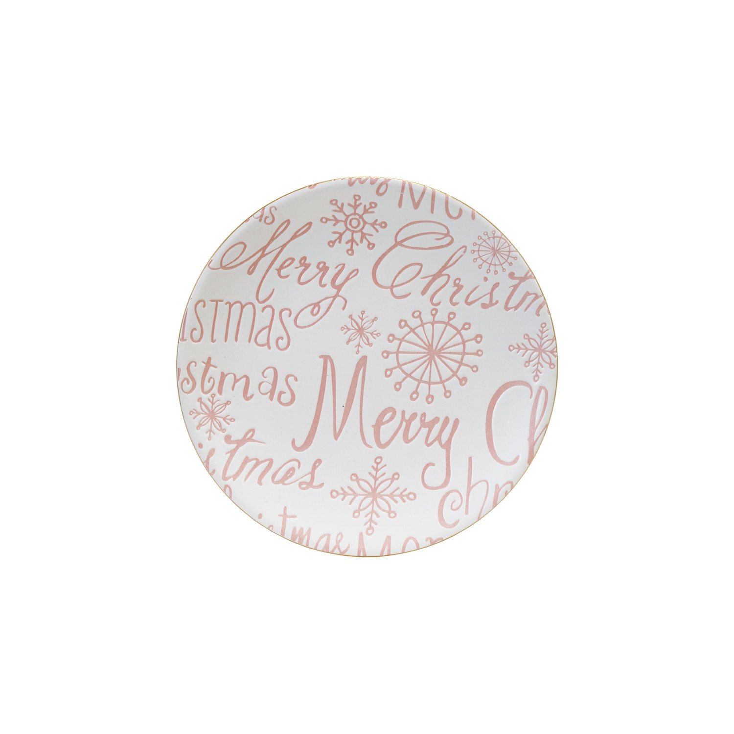 Stoneware Plate with Gold Color Rim "Merry Christmas", Pink & White