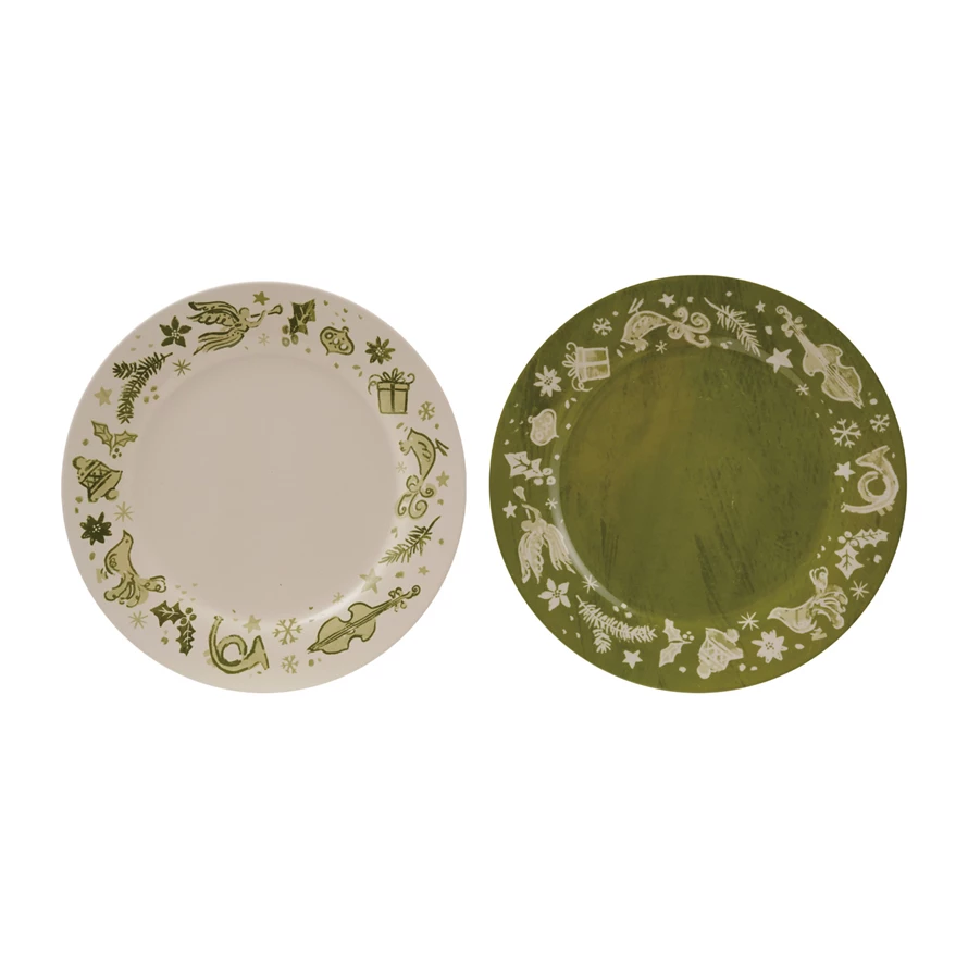 Catalog Name: 10" Round Stoneware Plate w/ Holiday Design, Green & Cream Color, 2 Styles ©