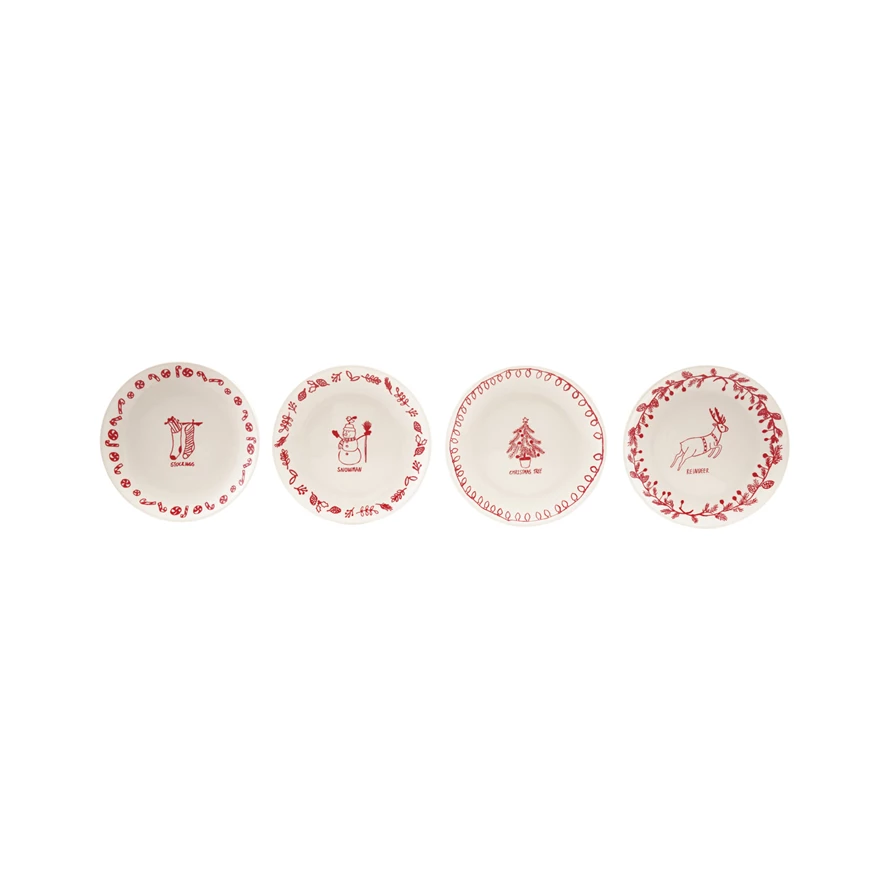 Stoneware Plate with Holiday Design, Icon & Word, White & Red, 4 Styles
